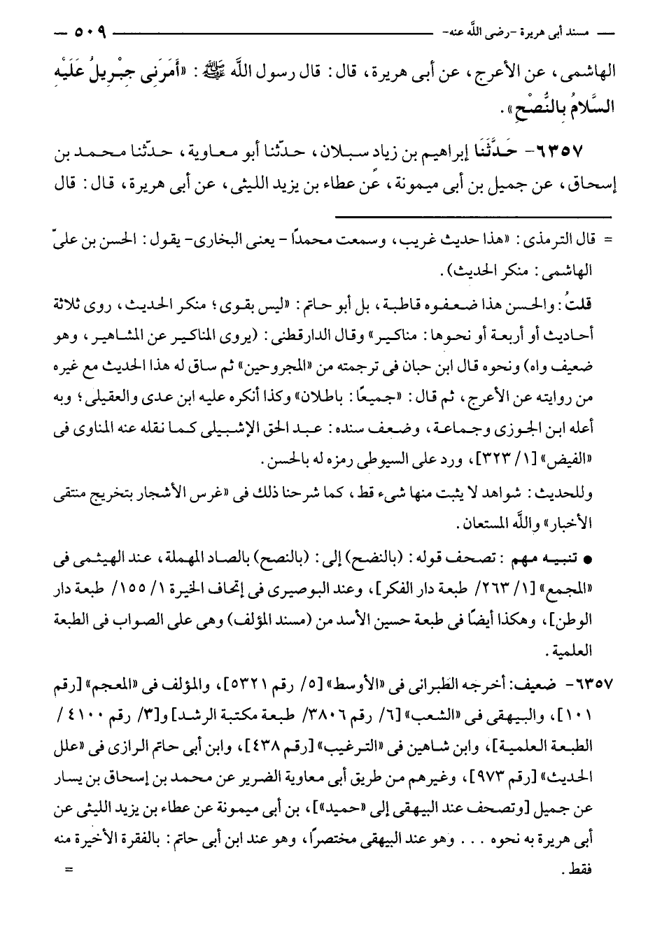 الهاشمى، عن الأعرج، عن أبى هريرة، قال: قال رسول الله - صلى الله عليه وسلم -: "أَمَرَنِى جِبْرِيلُ عَلَيْهِ السَّلامُ بِالنُّصْحِ".