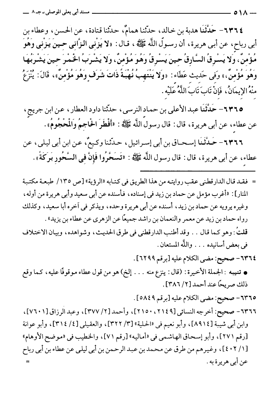 ٦٣٦٤ - حَدَّثَنَا هدبة بن خالدٍ، حدّثنا همامٌ، حدّثنا قتادة، عن الحسن، وعطاء بن أبى رباحٍ، عن أبى هريرة، أن رسول الله - صلى الله عليه وسلم -، قال: "لا يَزْنِى الزَّانِى حِينَ يَزْنِى وَهُوَ مُؤْمِنٌ، وَلا يَسْرِقُ السَّارِقُ حِينَ يَسْرِقُ وَهُوَ مُؤْمِنٌ، وَلا يَشْرَبُ الخمْرَ حِينَ يَشْرَبُهَا وَهُوَ مُؤْمِنٌ،" وَفِى حَديثِ عَطَاءٍ: "وَلا يَنْتَهِبُ نُهْبَةً ذَاتَ شَرَفٍ وَهُوَ مُؤْمِنٌ"، قَالَ: يُنْزَعُ مِنْهُ الإِيمَانُ، فَإِنْ تَابَ تَابَ اللَّهُ عَلَيْهِ.