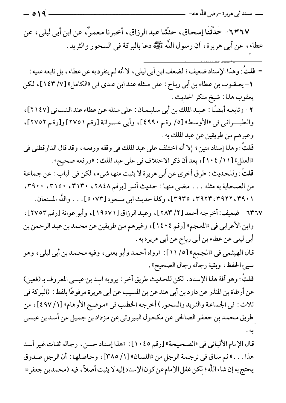 ٦٣٦٧ - حَدَّثَنَا إسحاق، حدّثنا عبد الرزاق، أخبرنا معمرٌ، عن ابن أبى ليلى، عن عطاءٍ، عن أبى هريرة، أن رسول الله - صلى الله عليه وسلم - دعا بالبركة في السحور والثريد.