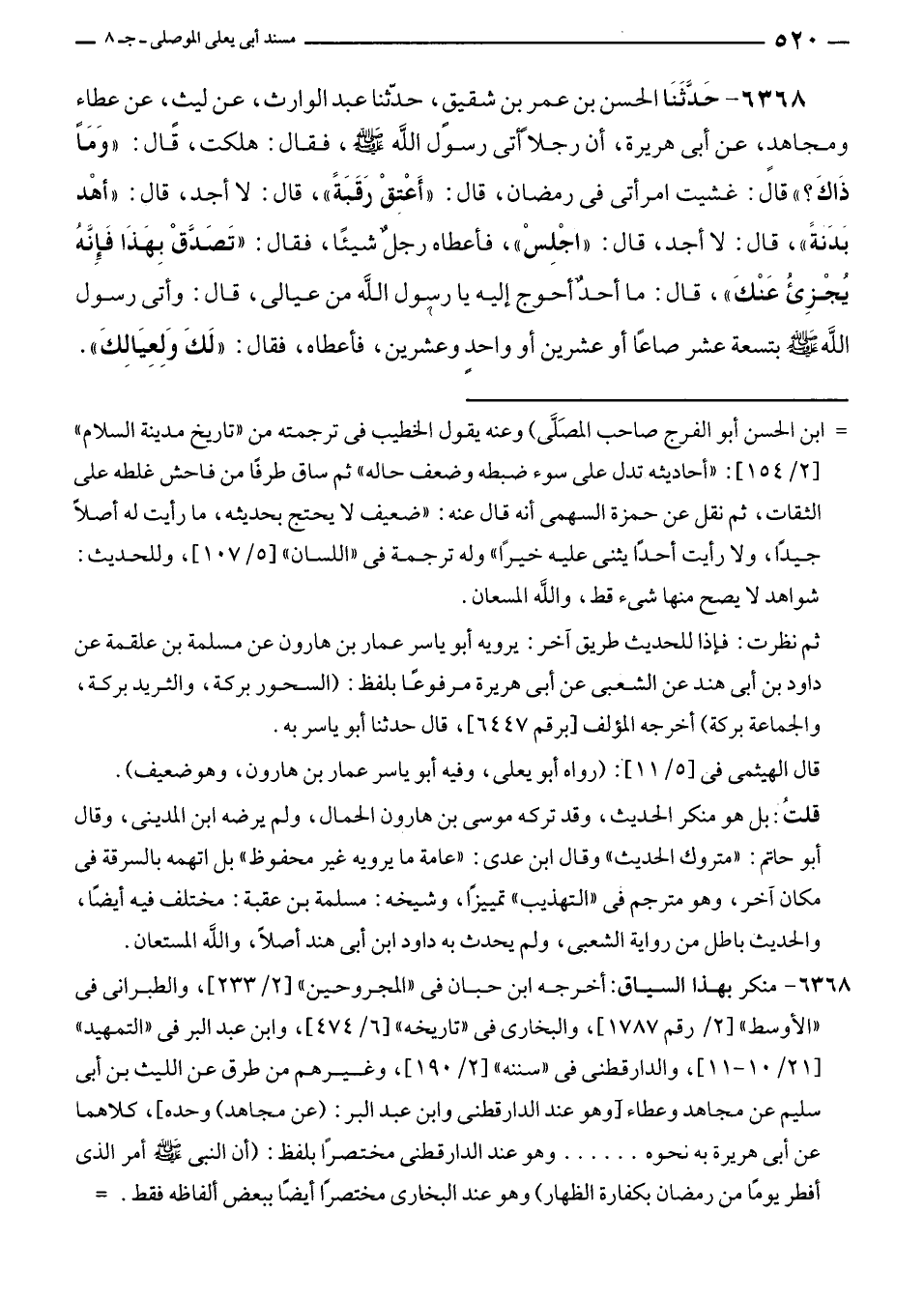 ٦٣٦٨ - حَدَّثَنَا الحسن بن عمر بن شقيقٍ، حدّثنا عبد الوارث، عن ليثٍ، عن عطاء ومجاهدٍ، عن أبى هريرة، أن رجلًا أتى رسول الله - صلى الله عليه وسلم -، فقال: هلكت، قال: "وَما ذَاكَ؟ " قال: غشيت امرأتى في رمضان، قال: "أَعْتِقْ رَقَبَةً"، قال: لا أجد، قال: "أهْد بَدَنَةً"، قال: لا أجد، قال: "اجْلِسْ"، فأعطاه رجلٌ شيئًا، فقال: "تَصَدَّقْ بِهَذَا فَإِنَّهُ يُجْزِئُ عَنْكَ"، قال: ما أحدٌ أحوج إليه يا رسول الله من عيالى، قال: وأتى رسول الله - صلى الله عليه وسلم - بتسعة عشر صاعًا أو عشرين أو واحدٍ وعشرين، فأعطاه، فقال: "لَكَ وَلِعِيَالِكَ".