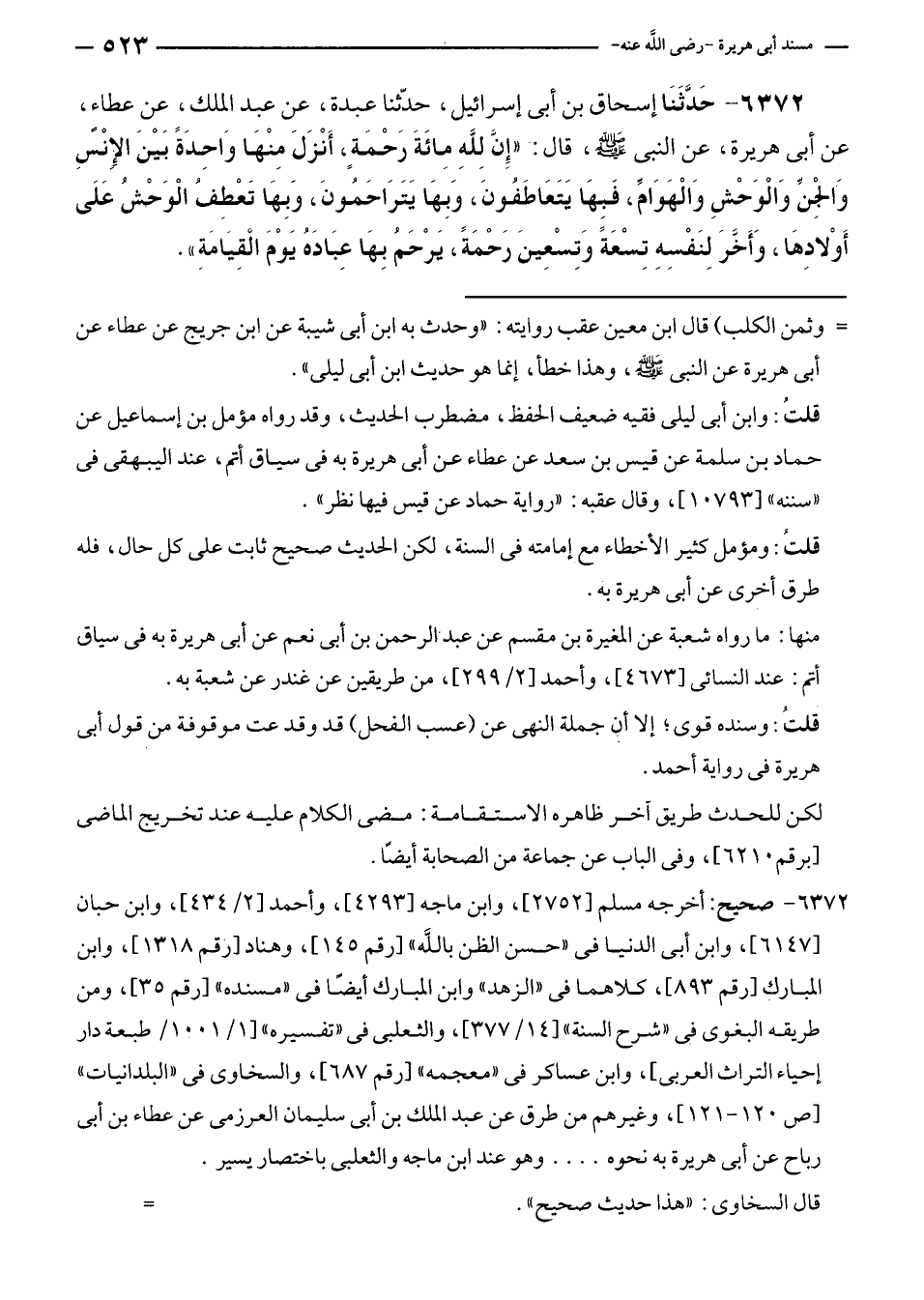 ٦٣٧٢ - حَدَّثَنَا إسحاق بن أبى إسرائيل، حدّثنا عبدة، عن عبد الملك، عن عطاءٍ، عن أبى هريرة، عن النبي - صلى الله عليه وسلم -، قال: "إِنَّ لِلَّهِ مِائَةَ رَحْمَةٍ، أَنْزَلَ مِنْهَا وَاحِدَةً بَيْنَ الإِنْسِ وَالْجِنِّ وَالْوَحْشِ وَالْهَوَامِّ، فَبِهَا يَتَعَاطَفُونَ، وَبِهَا يَتَرَاحَمُونَ، وَبِهَا تَعْطِفُ الْوَحْشُ عَلَى أَوْلادِهَا، وَأَخَّرَ لِنَفْسِهِ تِسْعَةً وَتِسْعِينَ رَحْمَةً، يَرْحَمُ بِهَا عِبَادَهُ يَوْمَ الْقِيامَةِ".
