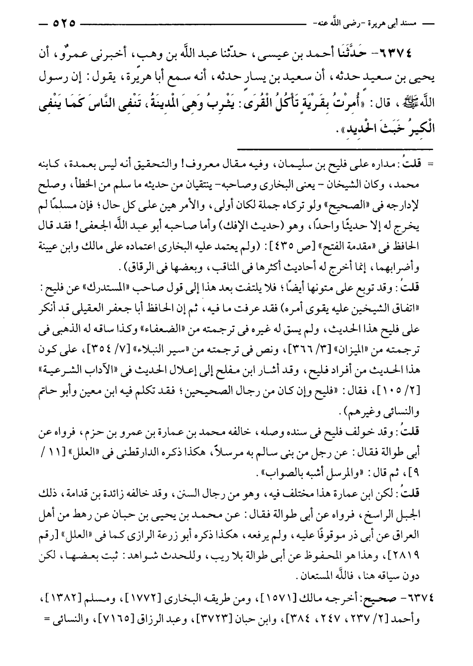 قلتُ: وقد توبع على متونها أيضًا؛ فلا يلتفت بعد هذا إلى قول صاحب "المستدرك" عن فليح: "اتفاق الشيخين عليه يقوى أمره" فقد عرفت ما فيه، ثم إن الحافظ أبا جعفر العقيلى قد أنكر على فليح هذا الحديث، ولم يسق له غيره في ترجمته من "الضعفاء" وكذا ساقه له الذهبى في ترجمته من "الميزان" [٣/ ٣٦٦]، ونص في ترجمته من "سير النبلاء" [٧/ ٣٥٤]، على كون هذا الحديث من أفراد فليح، وقد أشار ابن مفلح إلى إعلال الحديث في "الآداب الشرعية" [٢/ ١٠٥]، فقال: "فليح وإن كان من رجال الصحيحين؛ فقد تكلم فيه ابن معين وأبو حاتم والنسائى وغيرهم).