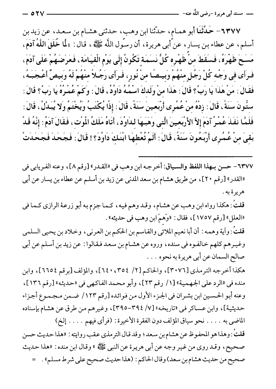 ٦٣٧٧ - حَدَّثَنَا أبو همامٍ، حدّثنا ابن وهبٍ، حدثنى هشام بن سعدٍ، عن زيد بن أسلم، عن عطاء بن يسارٍ، عن أبى هريرة، أن رسول الله - صلى الله عليه وسلم -، قال: "لمَا خَلَقَ اللَّهُ آدَمَ، مَسَحَ ظَهْرَهُ، فَسَقَطَ مِنْ ظَهْرِهِ كُلُّ نَسَمَةٍ تَكُونُ إِلَى يَوْمِ الْقِيَامَةِ، فَعَرَضَهُمْ عَلَى آدَمَ، فرَأَى فِي وَجْهِ كُلِّ رَجُلٍ مِنْهُمْ وَبِيصًا مِنْ نُورٍ، فَرَأَى رَجُلًا مِنْهُمْ لَهُ وَبِيصٌ أَعْجَبَهُ، فَقَالَ: مَنْ هَذَا يَا رَبِّ؟ قَالَ: هَذَا مِنْ وَلَدِكَ اسْمُهُ دَاوُدُ، قَالَ: وَكَمْ عُمْرُهُ يَا رَبِّ؟ قَالَ: سِتُّونَ سَنَةً، قَالَ: زِدْهُ مِنْ عُمُرِى أَرْبَعِينَ سَنَةً، قَالَ: إِذَا يُكْتَبُ وَيُخْتَمُ وَلا يُبَدَّلُ، قَالَ: فَلَمَّا نَفَذَ عُمْرُ آدَمَ إِلَّا الأَرْبَعِينَ الَّتِى وَهَبَهَا لِدَاوُدَ، أَتَاهُ مَلَكُ الموْتِ، فَقَالَ آدَمُ: إِنَّهُ قَدْ بَقِيَ مِنْ عُمُرِى أَرْبَعُونَ سَنَةً، قَالَ: أَلَمْ تُعْطِهَا ابْنَكِ دَاوُدَ؟! قَالَ: فَجَحَدَ فَجَحَدَتْ