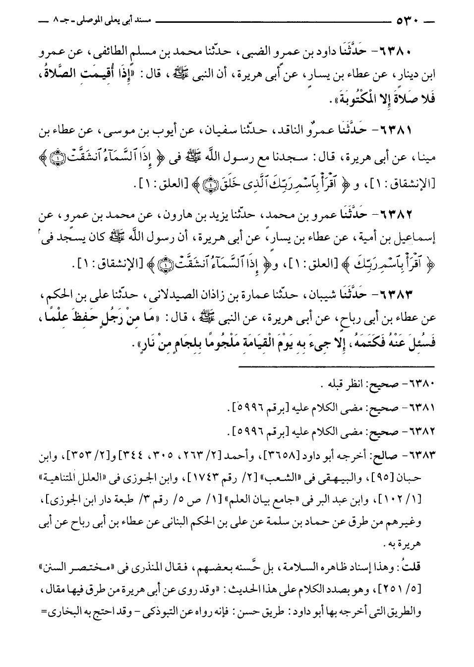 ٦٣٨٣ - صالح: أخرجه أبو داود [٣٦٥٨]، وأحمد [٢/ ٢٦٣، ٣٠٥، ٣٤٤] و [٢/ ٣٥٣]، وابن حبان [٩٥]، والبيهقى في "الشعب" [٢/ رقم ١٧٤٣]، وابن الجوزى في "العلل المتناهية" [١/ ١٠٢]، وابن عبد البر في "جامع بيان العلم" [١/ ص ٥/ رقم ٣/ طبعة دار ابن الجوزى]، وغيرهم من طرق عن حماد بن سلمة عن علي بن الحكم البنانى عن عطاء بن أبى رباح عن أبى هريرة به.