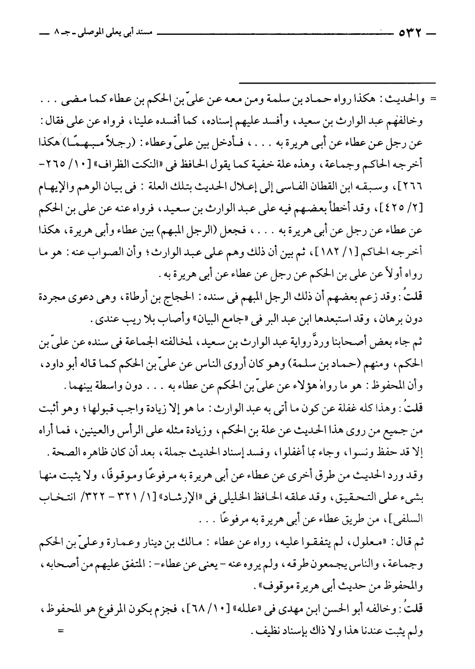 = والحديث: هكذا رواه حماد بن سلمة ومن معه عن عليّ بن الحكم بن عطاء كما مضى ... وخالفهم عبد الوارث بن سعيد، وأفسد عليهم إسناده، كما أفسده علينا، فرواه عن علي فقال: عن رجل عن عطاء عن أبى هريرة به ... ، فأدخل بين عليّ وعطاء: (رجلًا مبهمًا) هكذا أخرجه الحاكم وجماعة، وهذه علة خفية كما يقول الحافظ في "النكت الظراف" [١٠/ ٢٦٥ - ٢٦٦]، وسبقه ابن القطان الفاسى إلى إعلال الحديث بتلك العلة: في بيان الوهم والإيهام [٢/ ٤٢٥]، وقد أخطأ بعضهم فيه على عبد الوارث بن سعيد، فرواه عنه عن علي بن الحكم عن عطاء عن رجل عن أبى هريرة به ... ، فجعل (الرجل المبهم) بين عطاء وأبى هريرة، هكذا أخرجه الحاكم [١/ ١٨٢]، ثم بين أن ذلك وهم على عبد الوارث؛ وأن الصواب عنه: هو ما رواه أولًا عن علي بن الحكم عن رجل عن عطاء عن أبى هريرة به.