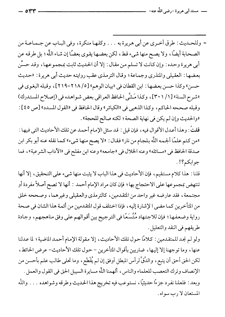 ولو لم نجد للمتقدمين: كلامًا حول تلك الأحاديث، إلا مقولة الإمام أحمد الماضية؛ لما عدلنا عنها، وما توجهنا! لا إليها، ضاربين بأقوال المتأخرين - حول تلك الأحاديث - عرض الحائط، لكن الحق أحق أن يتبع، والدَّقَّ لرأس المبطل أوفق إن لم يُقْطَع، وما تحلى طالب علم بأحسن من الإنصاف وترك التعصب للعلماء والناس، ألهمنا الله مسايرة السبيل الحق في القول والعمل.
