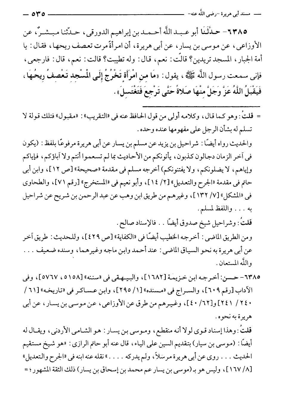 ٦٣٨٥ - حدَّثَنَا أبو عبد الله أحمد بن إبراهيم الدورقى، حدّثنا مبشرٌ، عن الأوزاعى، عن موسى بن يسارٍ، عن أبى هريرة، أن امرأةً مرت تعصف ريحها، فقال: يا أمة الجبار، المسجد تريدين؟ قالت: نعم، قال: وله تطيبت؟ قالت: نعم، قال: فارجعى، فإنى سمعت رسول الله - صلى الله عليه وسلم -، يقول: "مَا مِنِ امْرَأَةٍ تَخْرُجُ إِلَى الْمسْجِدِ تَعْصِفُ رِيحُهَا، فَيَقْبَلُ اللهُ عَزَّ وَجَلَّ مِنْهَا صَلاةً حَتَّى تَرْجِعَ فَتَغْتَسِلَ".