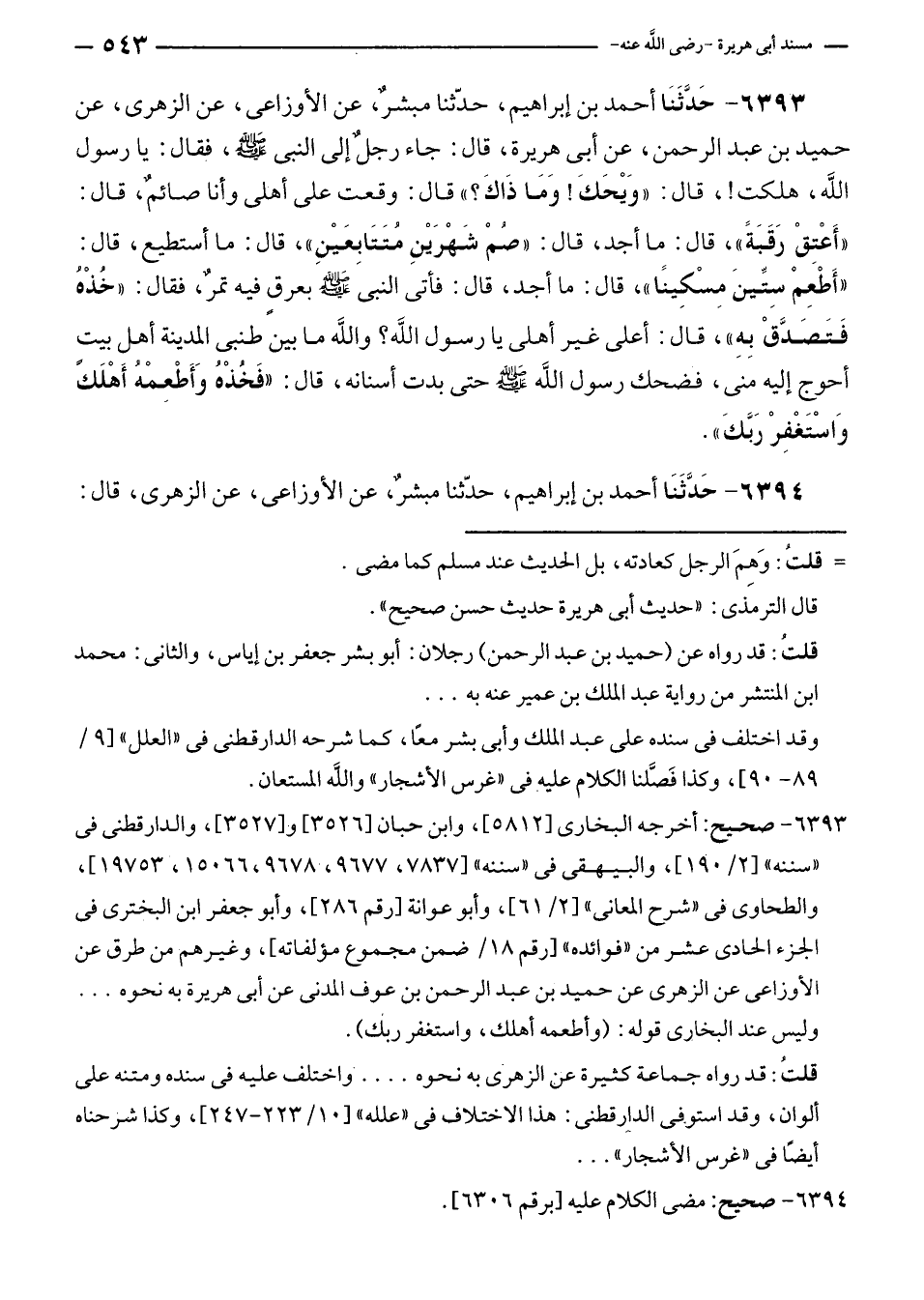 ٦٣٩٣ - صحيح: أخرجه البخارى [٥٨١٢]، وابن حبان [٣٥٢٦]، و [٣٥٢٧]، والدارقطنى في "سننه" [٢/ ١٩٠]، والبيهقى في "سننه" [٧٨٣٧، ٩٦٧٧، ٩٦٧٨، ١٥٠٦٦، ١٩٧٥٣]، والطحاوى في "شرح المعانى" [٢/ ٦١]، وأبو عوانة [رقم ٢٨٦]، وأبو جعفر بن البخترى في الجزء الحادى عشر من "فوائده" [رقم ١٨/ ضمن مجموع مؤلفاته]، وغيرهم من طرق عن الأوزاعى عن الزهرى عن حميد بن عبد الرحمن بن عوف المدنى عن أبى هريرة به نحوه ... وليس عند البخارى قوله: (وأطعمه أهلك، واستغفر ربك).