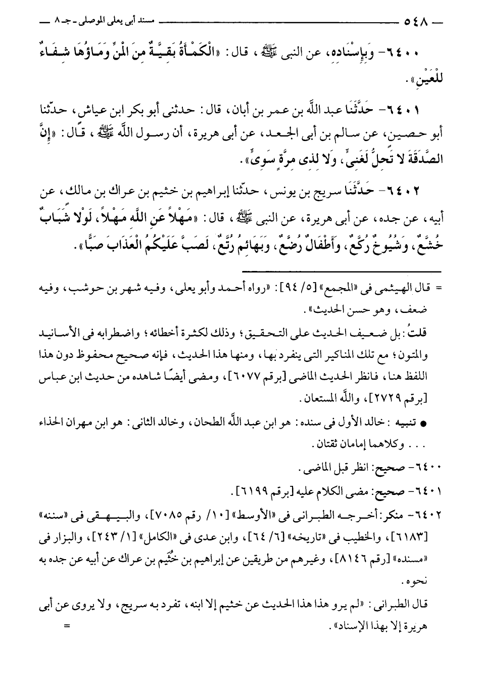 ٦٤٠١ - حَدَّثَنَا عبد الله بن عمر بن أبان، قال: حدثنى أبو بكر بن عياشٍ، حدّثنا أبو حصينٍ، عن سالم بن أبى الجعد، عن أبى هريرة، أن رسول الله - صلى الله عليه وسلم -، قَال: "إِنَّ الصَّدَقَةَ لا تَحِلُّ لَغَنِيٍّ، وَلا لِذِى مِرَّةٍ سَوِيٍّ".