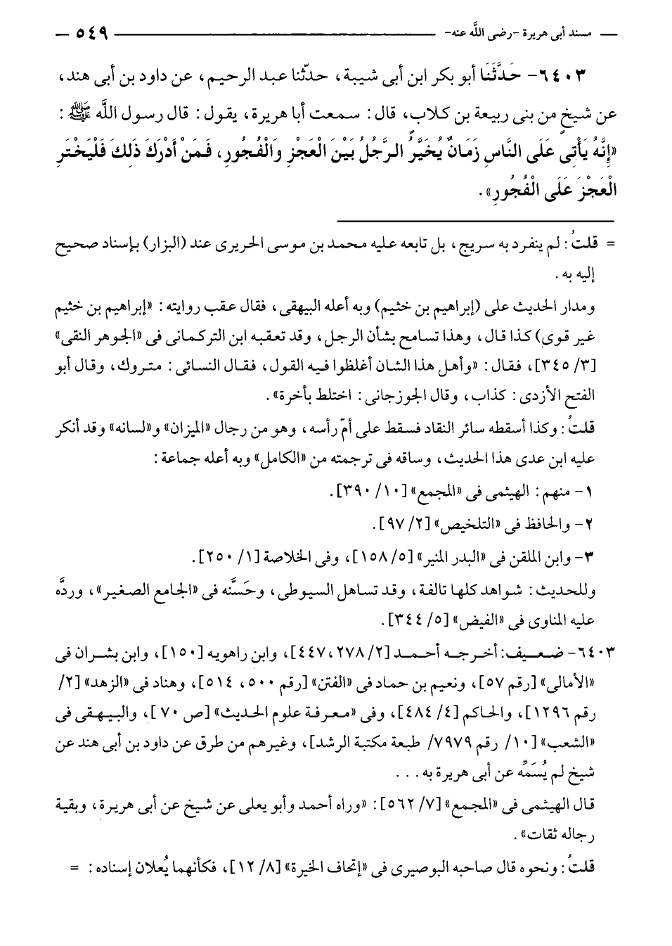 ٦٤٠٣ - حَدَّثَنَا أبو بكر بن أبى شيبة، حدّثنا عبد الرحيم، عن داود بن أبى هند، عن شيخٍ من بنى ربيعة بن كلابٍ، قال: سمعت أبا هريرة، يقول: قال رسول الله - صلى الله عليه وسلم -: "إِنَّهُ يَأْتِى عَلَى النَّاسِ زَمَانٌ يُخَيَّرُ الرَّجُلُ بَيْنَ الْعَجْزِ وَالْفُجُورِ، فَمَنْ أَدْرَكَ ذَلِكَ فَلْيَخْتَرِ الْعَجْزَ عَلَى الْفُجُورِ".