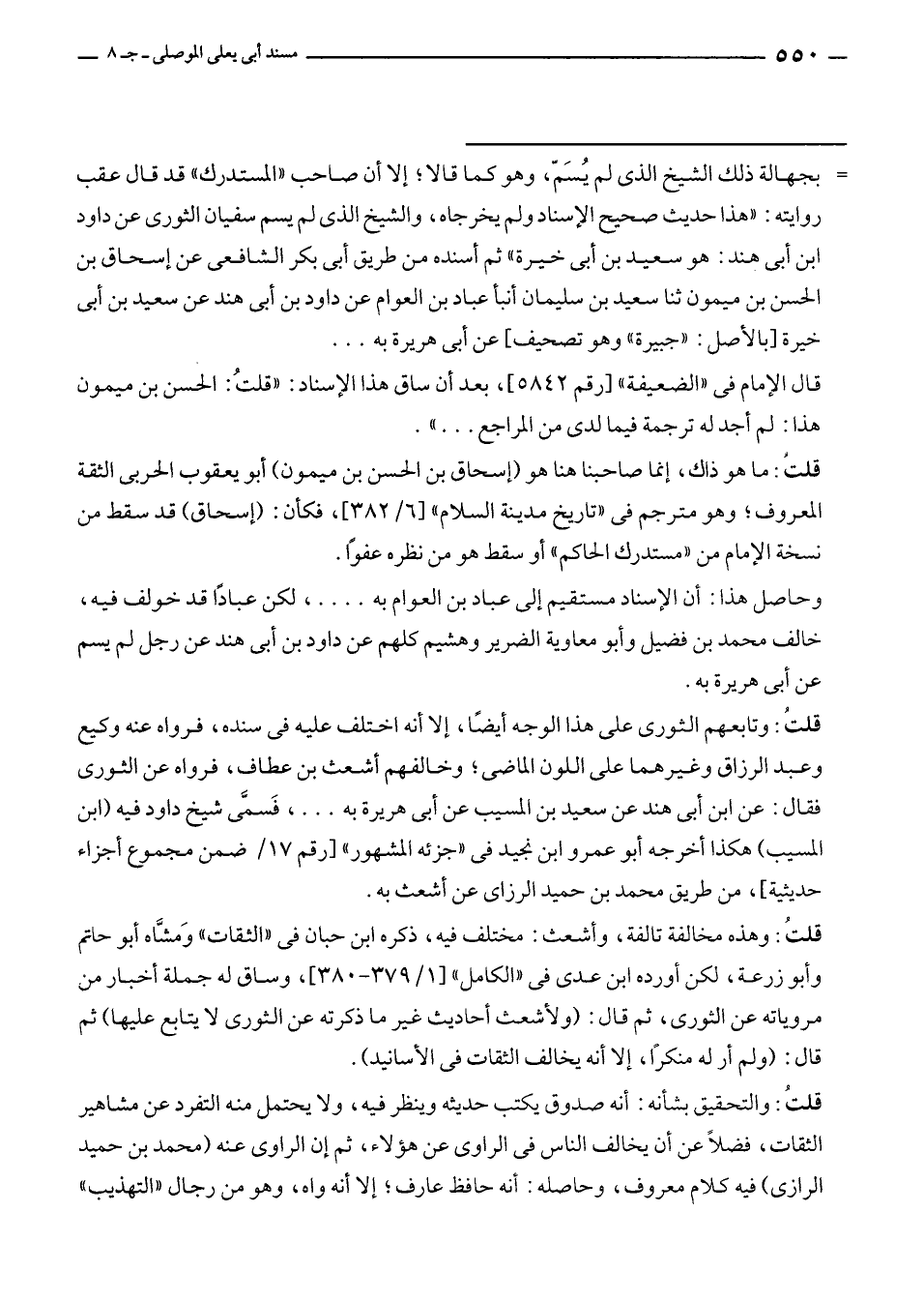 قلتُ: والتحقيق بشأنه: أنه صدوق يكتب حديثه وينظر فيه، ولا يحتمل منه التفرد عن مشاهير الثقات، فضلًا عن أن يخالف الناس في الراوى عن هؤلاء، ثم إن الراوى عنه (محمد بن حميد الرازى) فيه كلام معروف، وحاصله: أنه حافظ عارف؛ إلا أنه واه، وهو من رجال "التهذيب" =