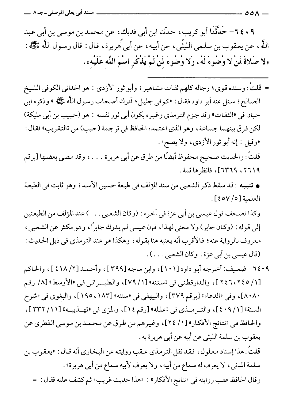 ٦٤٠٩ - حَدَّثَنا أبو كريبٍ، حدّثنا ابن أبى فديكٍ، عن محمد بن موسى بن أبى عبد الله، عن يعقوب بن سلمى الليثى، عن أبيه، عن أبى هريرة، قال: قال رسول الله - صلى الله عليه وسلم -: "لا صَلاةَ لمِنْ لا وُضُوءَ لَهُ، وَلا وُضُوءَ لمِنْ لَمْ يَذْكُرِ اسْمَ اللهِ عَلَيْهِ".