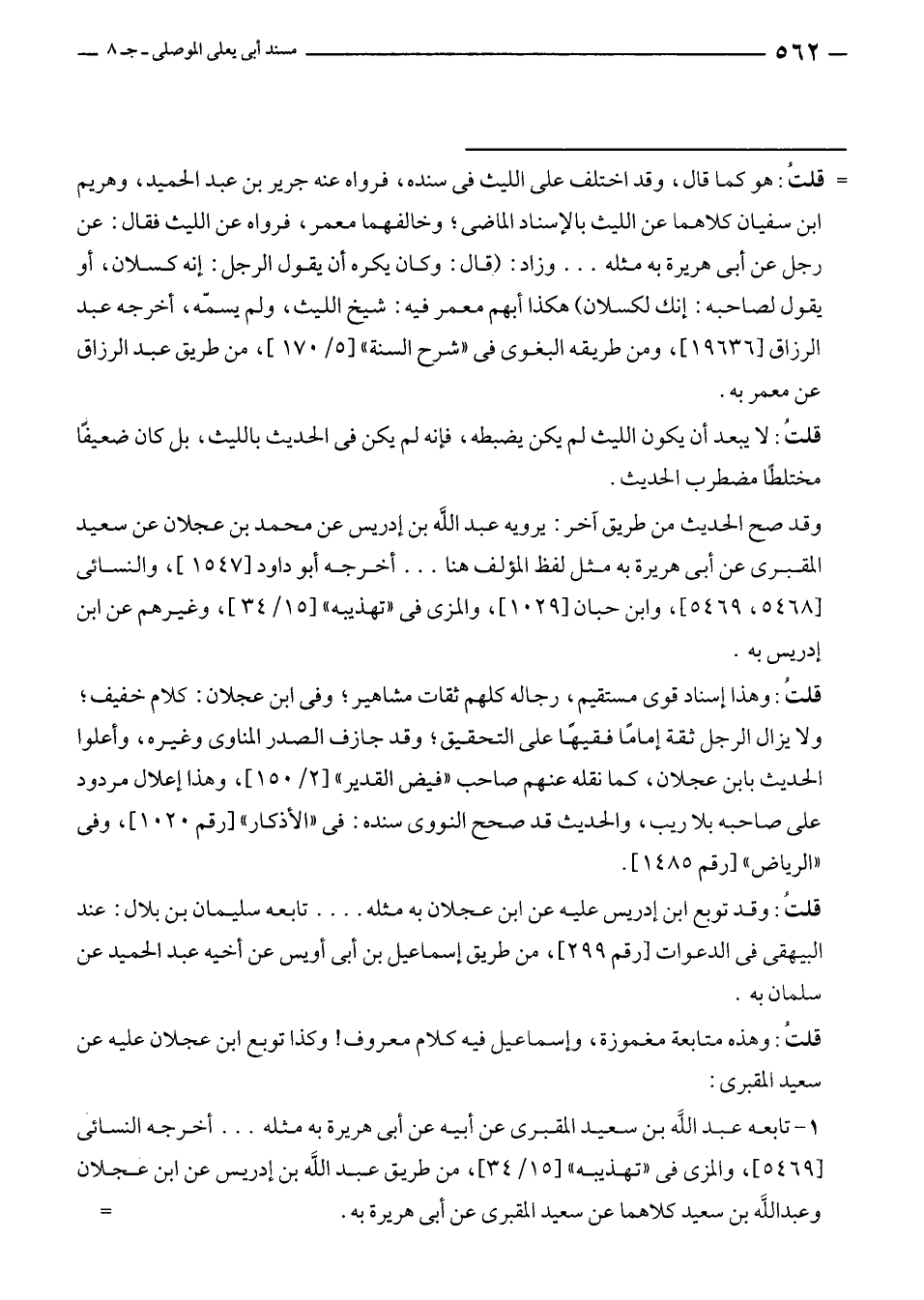 = قلتُ: هو كما قال، وقد اختلف على الليث في سنده، فرواه عنه جرير بن عبد الحميد، وهريم بن سفيان كلاهما عن الليث بالإسناد الماضى؛ وخالفهما معمر، فرواه عن الليث فقال: عن رجل عن أبى هريرة به مثله ... وزاد: (قال: وكان يكره أن يقول الرجل: إنه كسلان، أو يقول لصاحبه: إنك لكسلان) هكذا أبهم معمر فيه: شيخ الليث، ولم يسمّه، أخرجه عبد الرزاق [١٩٦٣٦]، ومن طريقه البغوى في "شرح السنة" [٥/ ١٧٠]، من طريق عبد الرزاق عن معمر به.