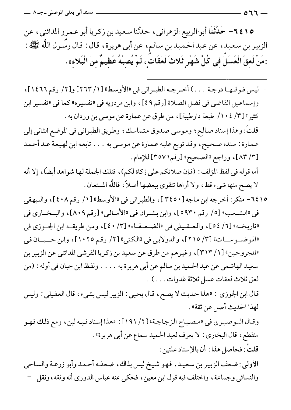 ٦٤١٥ - حَدَّثَنَا أبو الربيع الزهرانى، حدّثنا سعيد بن زكريا أبو عمرٍو المدائنى، عن الزبير بن سعيدٍ، عن عبد الحميد بن سالمٍ، عن أبى هريرة، قال: قال رسول الله - صلى الله عليه وسلم -: "مَنْ لَعِقَ الْعَسَلَ فِي كُلِّ شَهْرٍ ثَلاثَ لَعَقَاتٍ، لَمْ يُصِبْهُ عَظِيمٌ مِنَ الْبَلاءِ".
