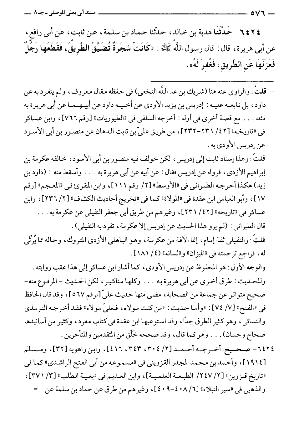 ٦٤٢٤ - حَدَّثَنَا هدبة بن خالدٍ، حدّثنا حماد بن سلمة، عن ثابتٍ، عن أبى رافعٍ، عن أبى هريرة، قال: قال رسول الله - صلى الله عليه وسلم -: "كَانَتْ شَجَرَةٌ تُضَيِّقُ الطَّرِيقَ، فَقَطَعَهَا رَجُلٌ فَعَزَلَهَا عَنِ الطَّرِيقِ، فَغُفِرَ لَهُ".