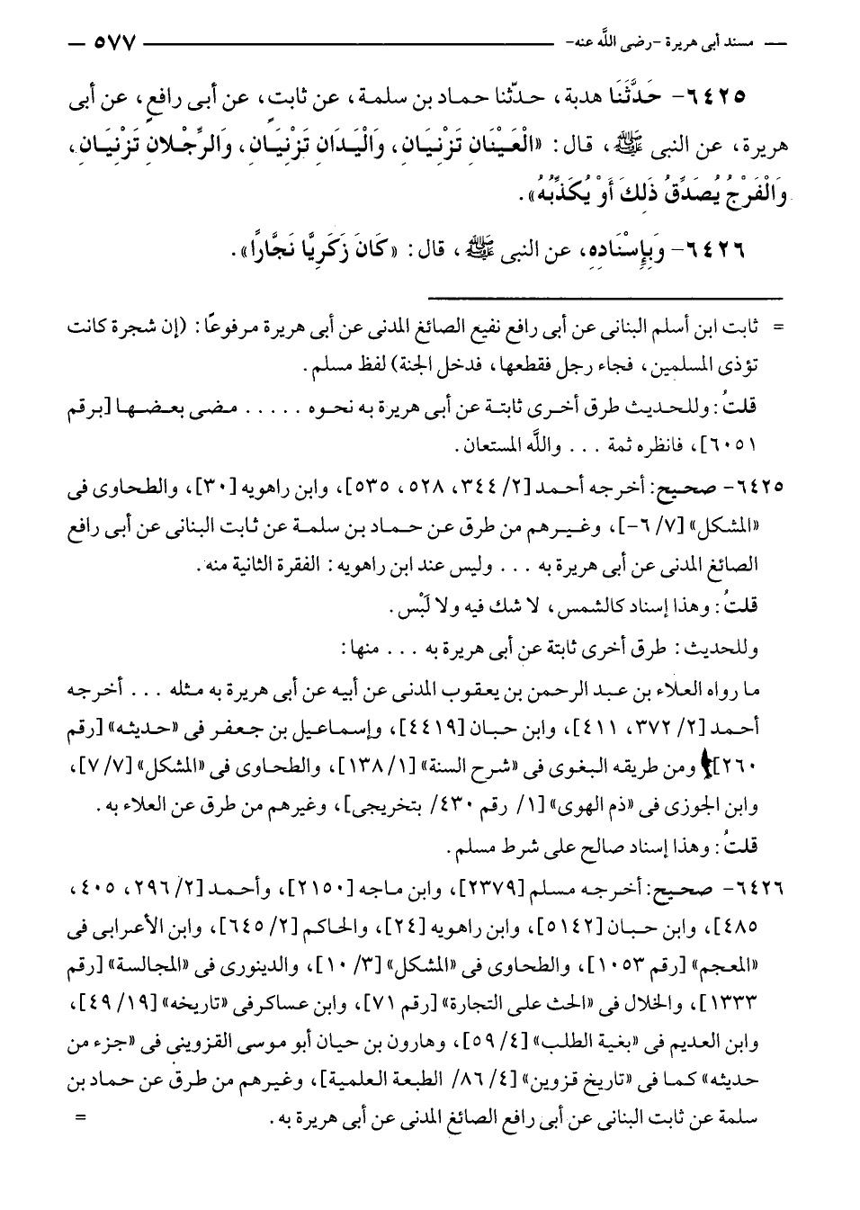٦٤٢٥ - حَدَّثَنَا هدبة، حدّثنا حماد بن سلمة، عن ثابتٍ، عن أبى رافعٍ، عن أبى هريرة، عن النبي - صلى الله عليه وسلم -، قال: "الْعَيْنَانِ تَزْنِيَانِ، وَالْيَدَانِ تَزْنِيَانِ، وَالرِّجْلانِ تَزْنِيَانِ، وَالْفَرْجُ يُصَدِّقُ ذَلِكَ أَوْ يُكَذِّبُهُ".
