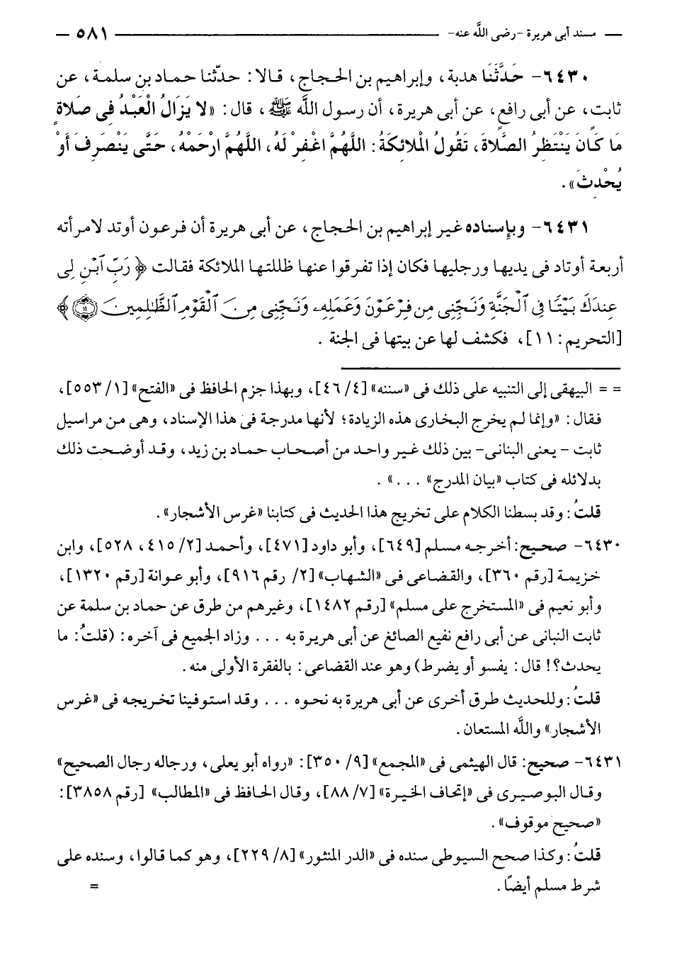 ٦٤٣٠ - حَدَّثَنَا هدبة، وإبراهيم بن الحجاج، قالا: حدّثنا حماد بن سلمة، عن ثابتٍ، عن أبى رافعٍ، عن أبى هريرة، أن رسول الله - صلى الله عليه وسلم -، قال: "لا يَزَالُ الْعَبْدُ فِي صَلاةٍ مَا كَانَ يَنْتَظِر الصَّلاةَ، تَقُولُ الْملائِكَةُ: اللَّهُمَّ اغْفِرْ لَهُ، اللَّهُمَّ ارْحَمْهُ، حَتَّى يَنْصَرِفَ أَوْ يُحْدِثَ".