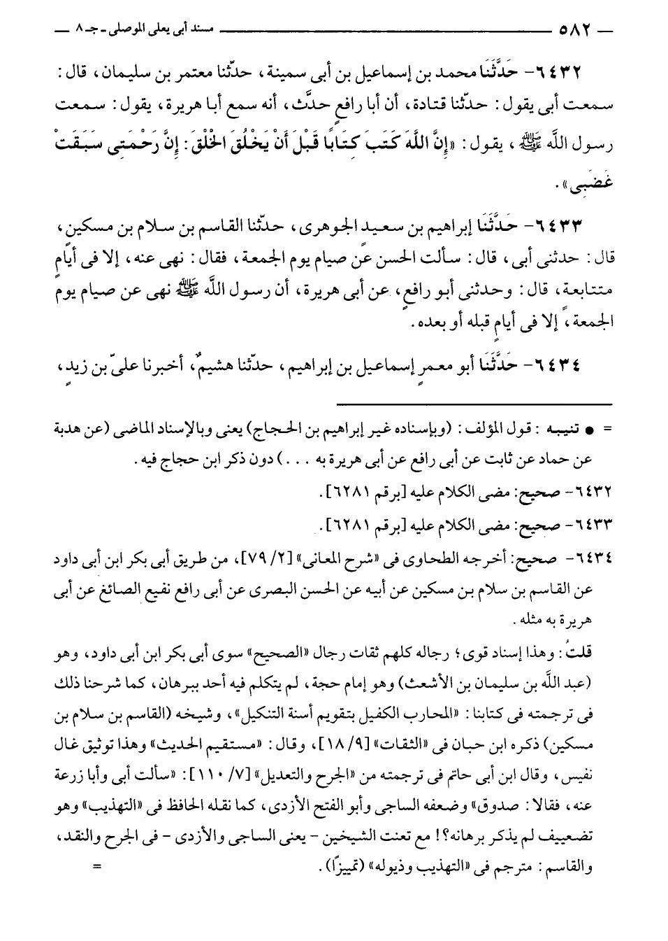 ٦٤٣٣ - حَدَّثَنَا إبراهيم بن سعيدٍ الجوهرى، حدّثنا القاسم بن سلام بن مسكينٍ، قال: حدثنى أبى، قال: سألت الحسن عن صيام يوم الجمعة، فقال: نهى عنه، إلا في أيامٍ متتابعةٍ، قال: وحدثنى أبو رافعٍ، عن أبى هريرة، أن رسول الله - صلى الله عليه وسلم - نهى عن صيام يوم الجمعة، إلا في أيامٍ قبله أو بعده.