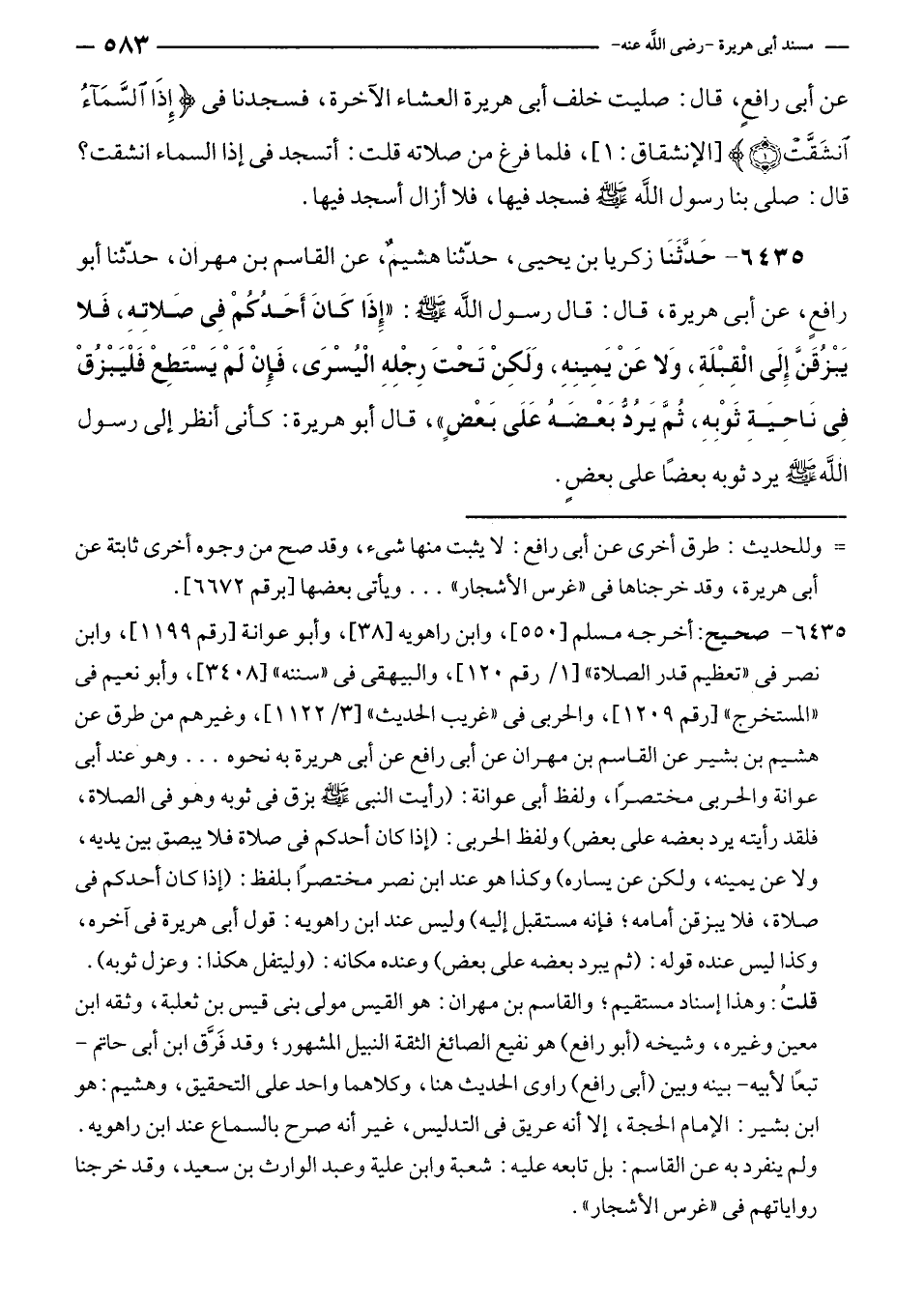 ٦٤٣٥ - صحيح: أخرجه مسلم [٥٥٠]، وابن راهويه [٣٨]، وأبو عوانة [رقم ١١٩٩]، وابن نصر في "تعظيم قدر الصلاة" [١/ رقم ١٢٠]، والبيهقى في "سننه" [٣٤٠٨]، وأبو نعيم في "المستخرج" [رقم ١٢٠٩]، والحربى في "غريب الحديث" [٣/ ١١٢٢]، وغيرهم من طرق عن هشيم بن بشير عن القاسم بن مهران عن أبى رافع عن أبى هريرة به نحوه. . . وهو عند أبى عوانة والحربى مختصرًا، ولفظ أبى عوانة: (رأيت النبي - صلى الله عليه وسلم - بزق في ثوبه وهو في الصلاة، فلقد رأيته يرد بعضه على بعض) ولفظ الحربى: (إذا كان أحدكم في صلاة فلا يبصق بين يديه، ولا عن يمينه، ولكن عن يساره) وكذا هو عند ابن نصر مختصرًا بلفظ: (إذا كان أحدكم في صلاة، فلا يبزقن أمامه، فإنه مستقبل إليه) وليس عند ابن راهويه: قول أبى هريرة في آخره، وكذا ليس عنده قوله: (ثم يبرد بعضه على بعض) وعنده مكانه: (وليتفل هكذا: وعزل ثوبه).