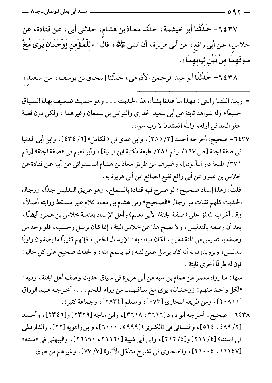 ٦٤٣٧ - حَدَّثَنَا أبو خيثمة، حدّثنا معاذ بن هشامٍ، حدثنى أبى، عن قتادة، عن خلاسٍ، عن أبى رافعٍ، عن أبى هريرة، أن النبي - صلى الله عليه وسلم -، قال: "لِلْمُؤْمِنِ زَوْجَتَانِ يَرَى مُخَّ سوقهِمَا مِنْ بَيْنِ ثِيَابِهِمَا".