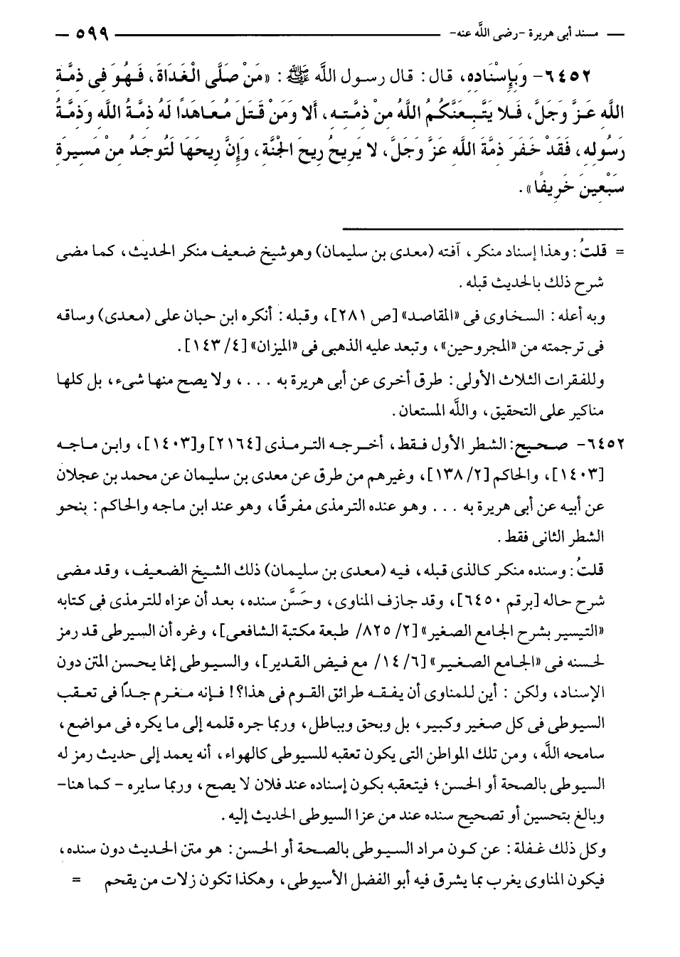 ٦٤٥٢ - وَبِإِسْنَادِهِ، قال: قال رسول الله - صلى الله عليه وسلم -: "مَنْ صَلَّى الْغَدَاةَ، فَهُوَ فِي ذِمَّةِ اللَّهِ عَزَّ وَجَلَّ، فَلا يَتَّبِعَنَّكُمُ اللَّهُ مِنْ ذِمَّتِهِ، أَلا وَمَنْ قَتَلَ مُعَاهَدًا لَهُ ذِمَّةُ اللهِ وَذِمَّةُ رَسُولِهِ، فَقَدْ خَفَرَ ذِمَّةَ اللَّهِ عَزَّ وَجَلَّ، لا يَرِيحُ رِيحَ الجَنَّةِ، وَإِنَّ رِيحَهَا لَتُوجَدُ مِنْ مَسِيرَةِ سَبْعِينَ خَرِيفًا".