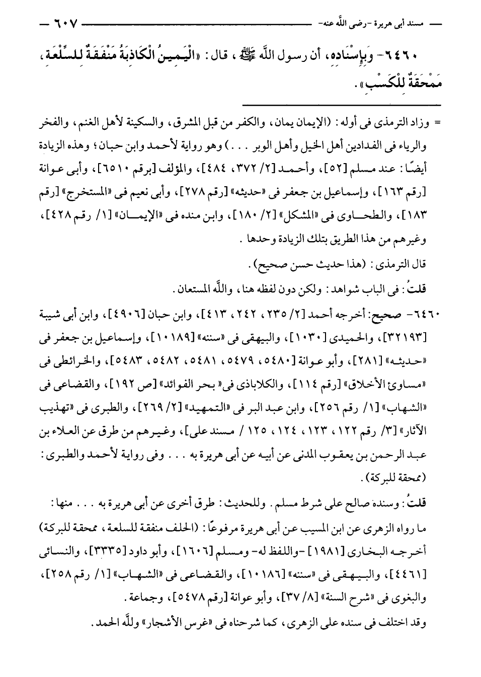 قلتُ: وسنده صالح على شرط مسلم. وللحديث: طرق أخرى عن أبى هريرة به. . . منها: ما رواه الزهرى عن ابن المسيب عن أبى هريرة مرفوعًا: (الحلف منفقة للسلعة، ممحقة للبركة) أخرجه البخارى [١٩٨١١]- واللفظ له - ومسلم [١٦٠٦]، وأبو داود [٣٣٣٥]، والنسائى [٤٤٦]، والبيهقى في "سننه" [١٠١٨٦]، والقضاعى في "الشهاب" [١/ رقم ٢٥٨]، والبغوى في شرح السنة" [٨/ ٣٧]، وأبو عوانة [رقم ٥٤٧٨]، وجماعة.