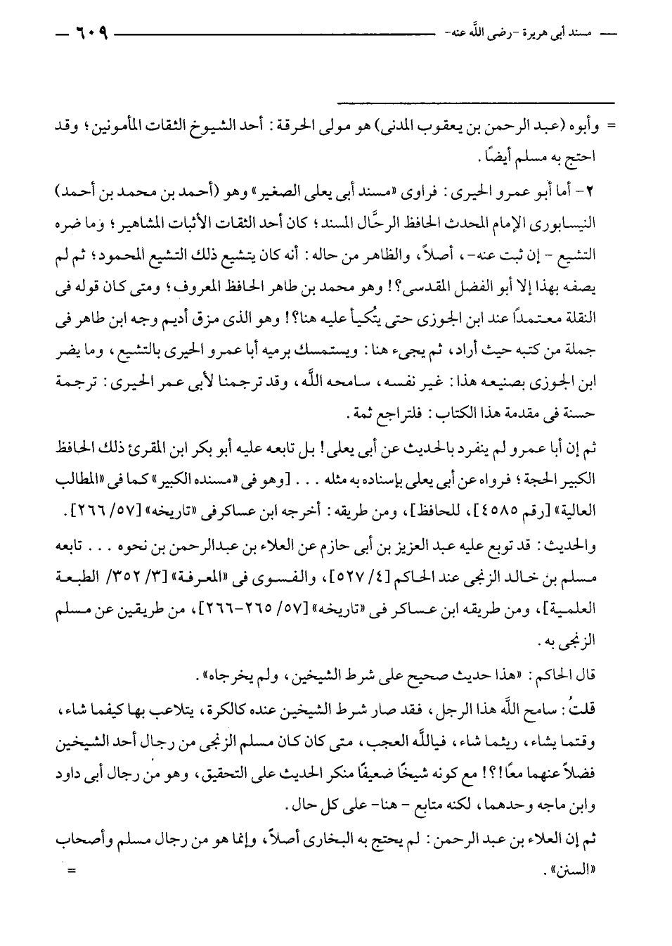 ٢ - أما أبو عمرو الحيرى: فراوى "مسند أبى يعلى الصغير" وهو (أحمد بن محمد بن أحمد) النيسابورى الإمام المحدث الحافظ الرحَّال المسند؛ كان أحد الثقات الأثبات المشاهير؛ وما ضره التشيع - إن ثبت عنه -، أصلًا، والظاهر من حاله: أنه كان يتشيع ذلك التشيع المحمود؛ ثم لم يصفه بهذا إلا أبو الفضل المقدسى؟! وهو محمد بن طاهر الحافظ المعروف؛ ومتى كان قوله في النقلة معتمدًا عند ابن الجوزى حتى يتكيأ عليه هنا؟! وهو الذي مزق أديم وجه ابن طاهر في جملة من كتبه حيث أراد، ثم يجئ هنا: ويستمسك برميه أبا عمرو الحيرى بالتشيع، وما يضر ابن الجوزى بصنيعه هذا: غير نفسه، سامحه الله، وقد ترجمنا لأبى عمر الحيرى: ترجمة حسنة في مقدمة هذا الكتاب: فلتراجع ثمة.