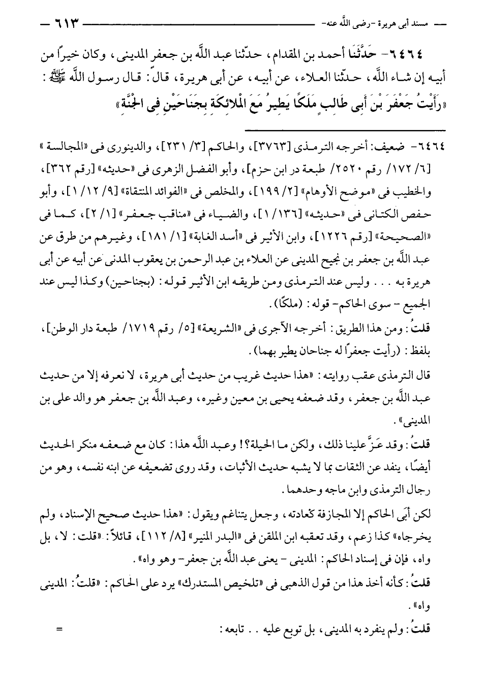 ٦٤٦٤ - حَدَّثَنَا أحمد بن المقدام، حدّثنا عبد الله بن جعفرٍ المدينى، وكان خيرًا من أبيه إن شاء الله، حدّثنا العلاء، عن أبيه، عن أبى هريرة، قال: قال رسول الله - صلى الله عليه وسلم -: "رَأَيْتُ جَعْفَرَ بْنَ أَبِي طَالِبٍ مَلَكًا يَطِيرُ مَعَ الملائِكَةِ بِجَنَاحَيْنِ فِي الْجَنَّةِ".