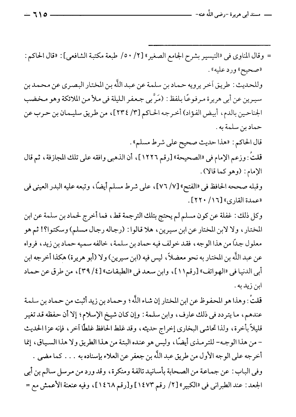 وكل ذلك: غفلة عن كون مسلم لم يحتج بتلك الترجمة قط، فما أخرج لحماد بن سلمة عن ابن المختار، ولا لابن المختار عن ابن سيرين، هلا قالوا: (رجاله رجال مسلم) وسكتوا؟! ثم هو معلول جدًّا من هذا الوجه، فقد خولف فيه حماد بن سلمة، خالفه سميه حماد بن زيد، فرواه عن عبد الله بن المختار به نحو معضلًا، ليس فيه (ابن سيرين) ولا (أبو هريرة) هكذا أخرجه ابن أبى الدنيا في "الهواتف" [رقم ١١]، وابن سعد في "الطبقات" [٤/ ٣٩]، من طرق عن حماد بن زيد به.