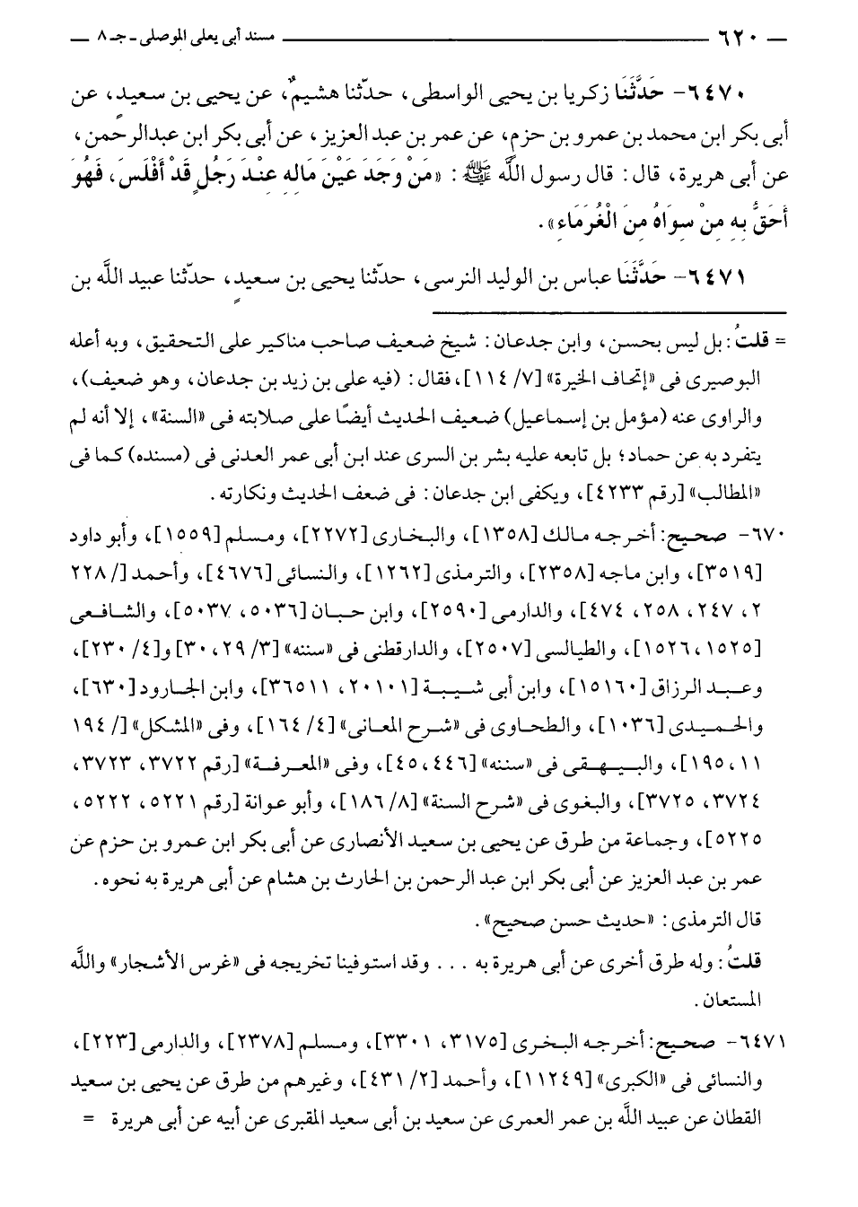 ٦٤٧٠ - حَدَّثَنَا زكريا بن يحيى الواسطى، حدّثنا هشيمٌ، عن يحيى بن سعيدٍ، عن أبى بكرٍ بن محمد بن عمرو بن حزم، عن عمر بن عبد العزيز، عن أبى بكر بن عبد الرحمن، عن أبى هريرة، قال: قال رسول الله - صلى الله عليه وسلم -: "مَنْ وَجَدَ عَيْنَ مَالِهِ عنْدَ رَجُلٍ قَدْ أَفْلَسَ، فَهُوَ أَحَقّ بِهِ مِنْ سِوَاهُ مِنَ الْغُرَمَاءِ".