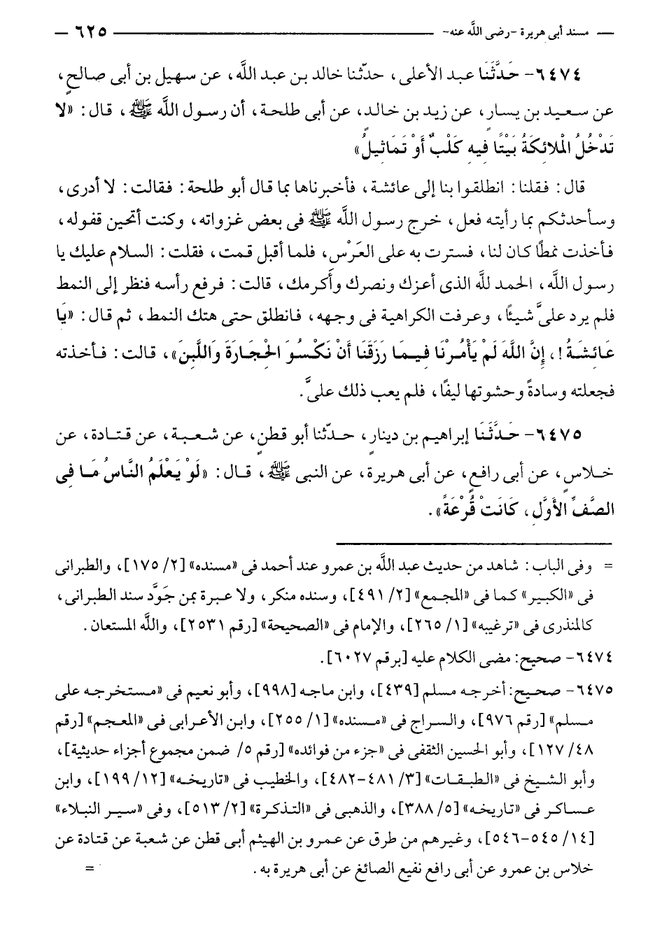 ٦٤٧٤ - حَدَّثَنَا عبد الأعلى، حدّثنا خالد بن عبد الله، عن سهيل بن أبى صالحٍ، عن سعيد بن يسارٍ، عن زيد بن خالدٍ، عن أبى طلحة، أن رسول الله - صلى الله عليه وسلم -، قال: "لا تدْخُل الْملائِكَةُ بَيْتًا فِيهِ كَلْبٌ أَوْ تَمَاثِيلُ".