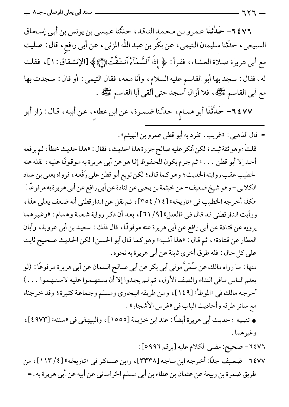 ٦٤٧٦ - حَدَّثَنَا عمرو بن محمدٍ الناقد، حدّثنا عيسى بن يونس بن أبى إسحاق السبيعى، حدّثنا سليمان التيمى، عن بكر بن عبد الله المزنى، عن أبى رافع، قال: صليت مع أبى هريرة صلاة العشاء، فقرأ: {إِذَا السَّمَاءُ انْشَقَّتْ (١)} [الانشقاق: ١]، فقلت له، فقال: سجد بها أبو القاسم عليه السلام، وأنا معه، فقال التيمى: أو قال: سجدت بها مع أبى القاسم - صلى الله عليه وسلم -، فلا أزال أسجد حتى ألقى أبا القاسم - صلى الله عليه وسلم -.