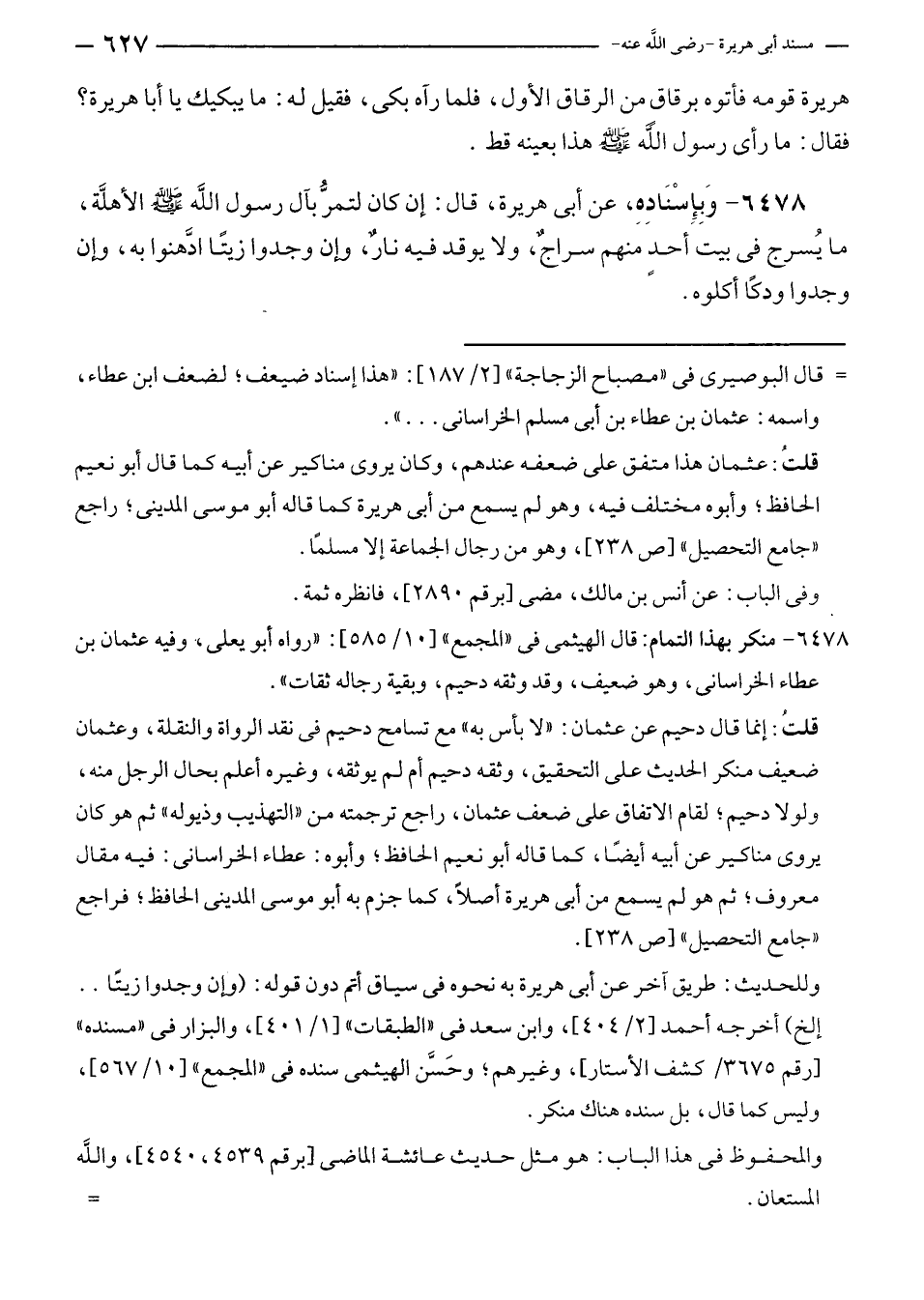 قلتُ: إنما قال دحيم عن عثمان: "لا بأس به" مع تسامح دحيم في نقد الرواة والنقلة، وعثمان ضعيف منكر الحديث على التحقيق، وثقه دحيم أم لم يوثقه، وغيره أعلم بحال الرجل منه، ولولا دحيم؛ لقام الاتفاق على ضعف عثمان، راجع ترجمته من "التهذيب وذيوله" ثم هو كان يروى مناكير عن أبيه أيضًا، كما قاله أبو نعيم الحافظ؛ وأبوه: عطاء الخراسانى: فيه مقال معروف؛ ثم هو لم يسمع من أبى هريرة أصلًا، كما جزم به أبو موسى المدينى الحافظ؛ فراجع "جامع التحصيل" [ص ٢٣٨].