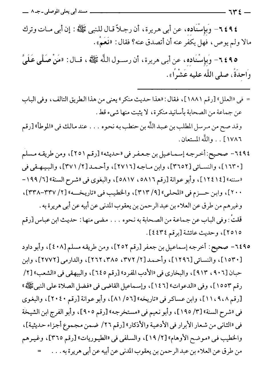 ٦٤٩٥ - صحيح: أخرجه إسماعيل بن جعفر [رقم ٢٥٢]، ومن طريقه مسلم [٤٠٨]، وأبو داود [١٥٣٠]، والنسائى [١٢٩٦]، وأحمد [٢/ ٣٧٢، ٣٨٥، ٢٦٢]، والدارمى [٢٧٧٢]، وابن حبان [٩٠٦، ٩١٣]، والبخارى في "الأدب المفرد" [رقم ٦٤٥]، والبيهقى في "الشعب" [٢/ رقم ١٥٥٣]، وفى "الدعوات" [١٤٦]، وإسماعيل القاضى في "فضل الصلاة على النبي - صلى الله عليه وسلم - " [رقم ٨، ٩، ١١]، وابن عساكر في "تاريخه" [٥٦/ ٨١]، وأبو عوانة [رقم ٢٠٤٠]، والبغوى في "شرح السنة" [٣/ ١٩٥]، وأبو نعيم في "مستخرجه" [رقم ٩٠٥]، وأبو الفرج ابن الشيخة في "الثاني من شعار الأبرار في الأدعية والأذكار" [رقم ٢٦/ ضمن مجموع أجزاء حديثية]، والخطيب في "موضح الأوهام" [٢/ ١٩]، والسلفى في "الطيوريات" [رقم ٣٦٥]، وغيرهم من طرق عن العلاء بن عبد الرحمن بن يعقوب المدنى عن أبيه عن أبى هريرة به ... =