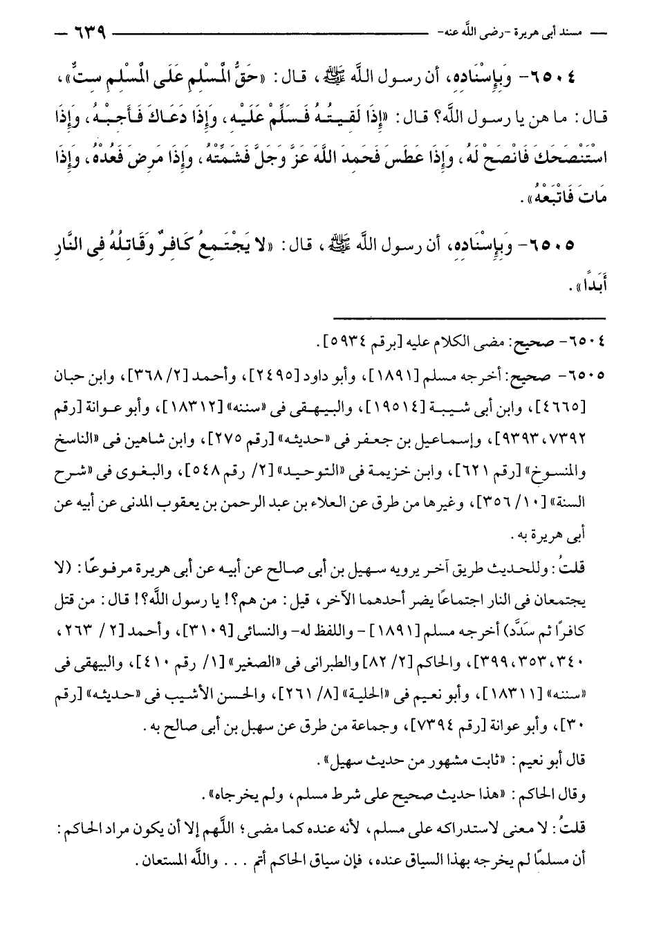٦٥٠٤ - وَبِإسنَادِهِ، أن رسول الله - صلى الله عليه وسلم -، قال: "حَقُّ المسْلِمِ عَلَى المسْلِمِ سِتٌّ"، قال: ما هن يا رسول الله؟ قال: "إذَا لَقيتُهُ فَسَلِّمْ عَلَيْهِ، وَإذَا دَعَاكَ فَأَجِبْهُ، وَإذَا اسْتَنْصَحَكَ فَانْصَحْ لَهُ، وَإذَا عَطَسَ فَحَمِدَ اللَّهَ عَزَّ وَجَلَّ فَشَمِّتْهُ، وَإذَا مَرِضَ فَعُدْهُ، وَإذَا مَاتَ فَاتْبَعْهُ".