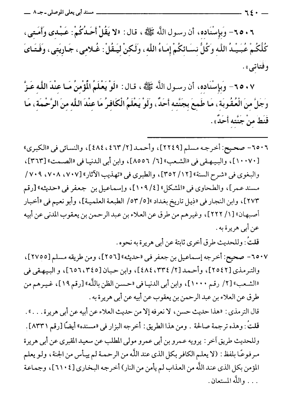 ٦٥٠٦ - صحيح: أخرجه مسلم [٢٢٤٩]، وأحمد [٢/ ٤٦٣، ٤٨٤]، والنسائى في "الكبرى" [١٠٠٧٠]، والبيهقى في "الشعب" [٦/ ٨٥٥٦]، وابن أبى الدنيا في "الصمت" [٣٦٣]، والبغوى في "شرح السنة" [١٢/ ٣٥٢]، والطبرى في "تهذيب الآثار" [٧٠٧، ٧٠٨، ٧٠٩/ مسند عمر]، والطحاوى في "المشكل" [٤/ ١٥٩]، وإسماعيل بن جعفر في "حديثه" [رقم ٢٧٣]، وابن النجار في "ذيل تاريخ بغداد" [٥/ ٥٣/ الطبعة العلمية]، وأبو نعيم في "أخبار أصبهان" [١/ ٢٢٢]، وغيرهم من طرق عن العلاء بن عبد الرحمن بن يعقوب المدنى عن أبيه عن أبى هريرة به.