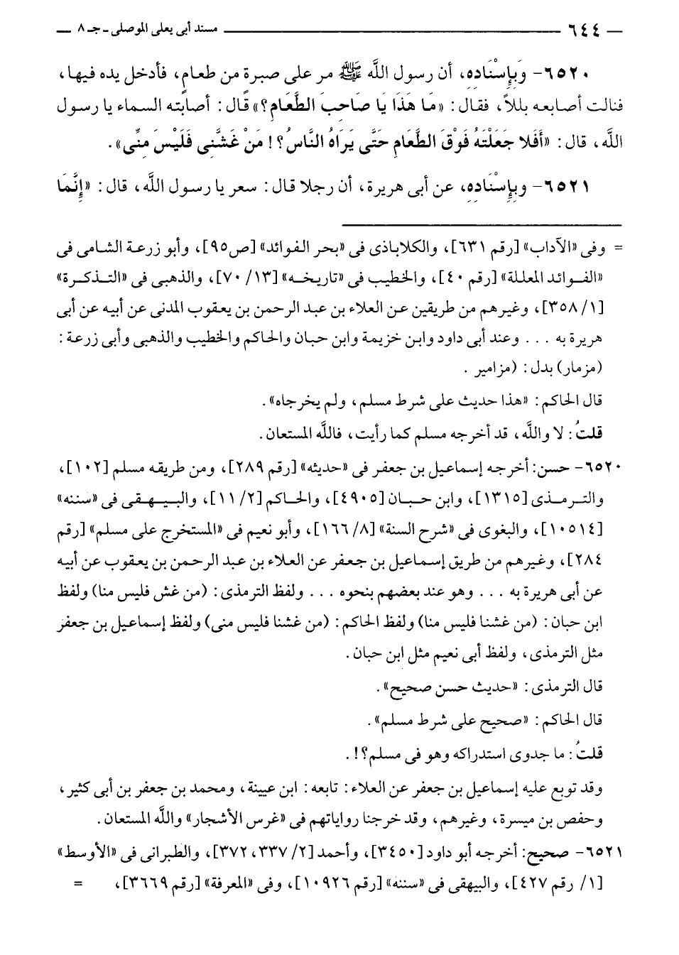 ٦٥٢٠ - حسن: أخرجه إسماعيل بن جعفر في "حديثه" [رقم ٢٨٩]، ومن طريقه مسلم [١٠٢]، والترمذى [١٣١٥]، وابن حبان [٤٩٠٥]، والحاكم [٢/ ١١]، والبيهقى في "سننه" [١٠٥١٤]، والبغوى في "شرح السنة" [٨/ ١٦٦]، وأبو نعيم في "المستخرج على مسلم" [رقم ٢٨٤]، وغيرهم من طريق إسماعيل بن جعفر عن العلاء بن عبد الرحمن بن يعقوب عن أبيه عن أبى هريرة به ... وهو عند بعضهم بنحوه ... ولفظ الترمذى: (من غش فليس منا) ولفظ ابن حبان: (من غشنا فليس منا) ولفظ الحاكم: (من غشنا فليس منى) ولفظ إسماعيل بن جعفر مثل الترمذى، ولفظ أبى نعيم مثل ابن حبان.
