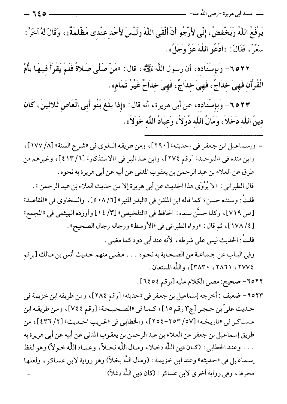٦٥٢٣ - ضعيف: أخرجه إسماعيل بن جعفر في "حديثه" [رقم ٢٨٤]، ومن طريقه ابن خزيمة في حديث عليّ بن حجر [ج ٣ رقم ١٥]، كما في "الصحيحة" [رقم ٧٤٤]، ومن طريقه ابن عساكر في "تاريخه" [٥٧/ ٢٥٣ - ٢٥٤]، والخطابى في "غريب الحديث" [٢/ ٤٣٦]، من طريق إسماعيل بن جعفر عن العلاء بن عبد الرحمن بن يعقوب المدنى عن أبيه عن أبى هريرة به ... وعند الخطابى: (كان دين الله دخلا، ومال الله نحلًا، وعباد الله خولًا) وهو لفظ إسماعيل في "حديثه" وعند ابن خزيمة: (ومال الله بخلًا) وهو رواية لابن عساكر، ولعلها محرفة، وفى رواية أخرى لابن عساكر: (كان دين الله دغلًا). =