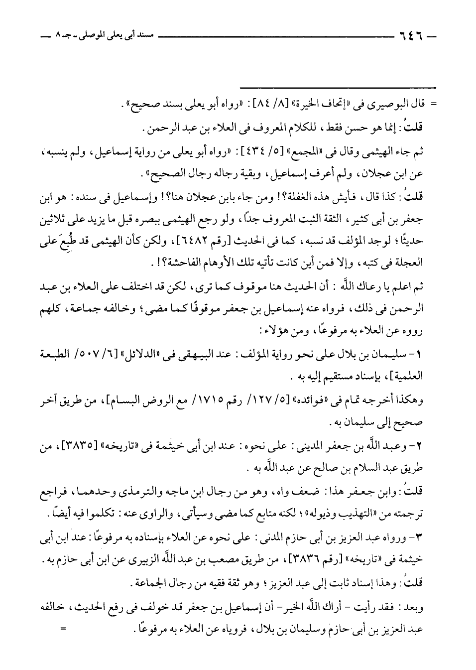 قلتُ: كذا قال، فأيش هذه الغفلة؟! ومن جاء بابن عجلان هنا؟! وإسماعيل في سنده: هو ابن جعفر بن أبى كثير، الثقة الثبت المعروف جدًّا، ولو رجع الهيثمى ببصره قبل ما يزيد على ثلاثين حديثًا؛ لوجد المؤلف قد نسبه، كما في الحديث [رقم ٦٤٨٢]، ولكن كأن الهيثمى قد طُبِعَ على العجلة في كتبه، وإلا فمن أين كانت تأتيه تلك الأوهام الفاحشة؟!.
