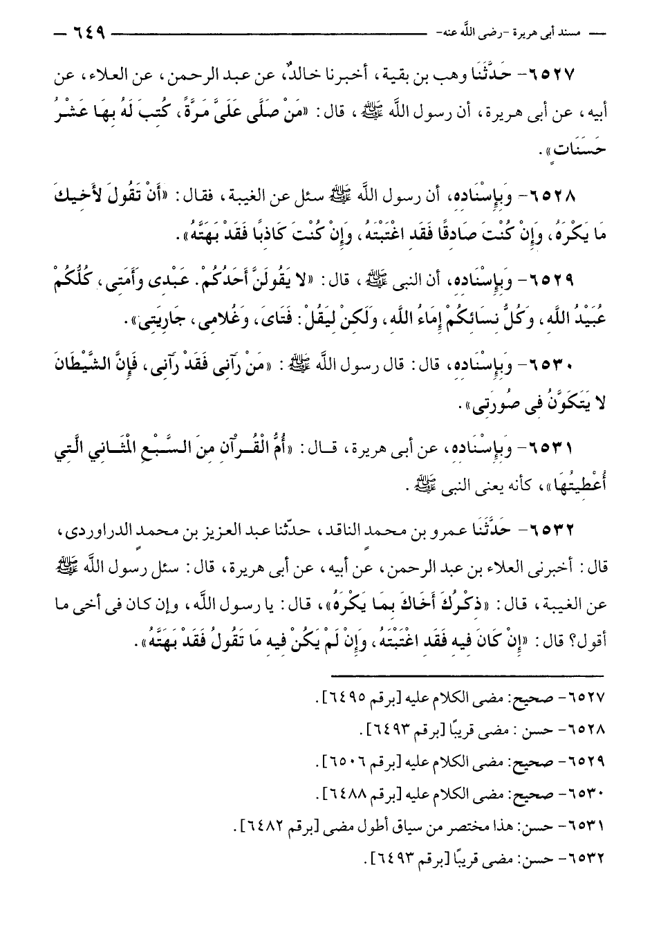 ٦٥٣٢ - حَدَّثَنَا عمرو بن محمدٍ الناقد، حدّثنا عبد العزيز بن محمدٍ الدراوردى، قال: أخبرنى العلاء بن عبد الرحمن، عن أبيه، عن أبى هريرة، قال: سئل رسول الله - صلى الله عليه وسلم - عن الغيبة، قال: "ذِكْرُكَ أَخَاكَ بِمَا يَكْرَهُ"، قال: يا رسول الله، وإن كان في أخى ما أقول؟ قال: "إنْ كَانَ فِيهِ فَقَدِ اغْتَبْتَهُ، وَإنْ لَمْ يَكُنْ فِيهِ مَا تَقُولُ فَقَدْ بَهَتَهُ".