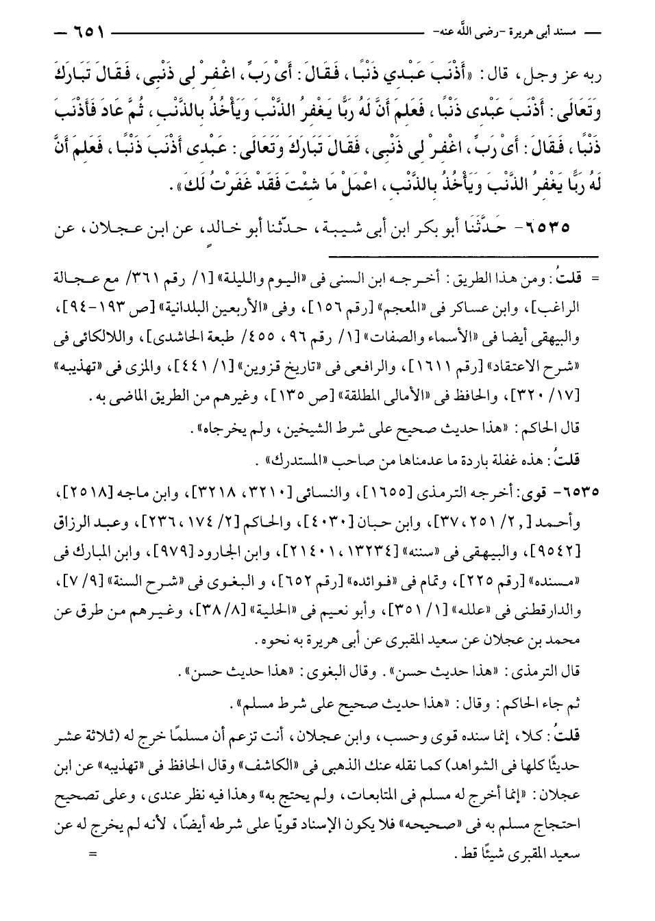 قلتُ: كلا، إنما سنده قوى وحسب، وابن عجلان، أنت تزعم أن مسلمًا خرج له (ثلاثة عشر حديثًا كلها في الشواهد) كما نقله عنك الذهبى في "الكاشف" وقال الحافظ في "تهذيبه" عن ابن عجلان: "إنما أخرج له مسلم في المتابعات، ولم يحتج به" وهذا فيه نظر عندى، وعلى تصحيح احتجاج مسلم به في "صحيحه" فلا يكون الإسناد قويّا على شرطه أيضًا، لأنه لم يخرج له عن سعيد المقبرى شيئًا قط. =