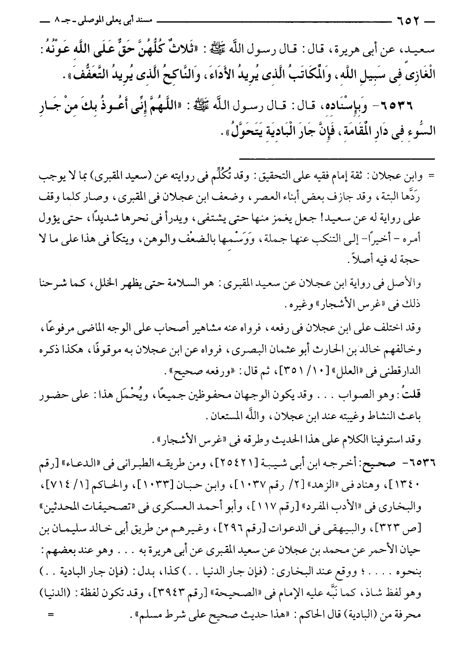 ٦٥٣٦ - صحيح: أخرجه ابن أبى شيبة [٢٥٤٢١]، ومن طريقه الطبراني في "الدعاء" [رقم [١٣٤٠]، وهناد في "الزهد" [٢/ رقم ١٠٣٧]، وابن حبان [١٠٣٣]، والحاكم [١/ ٧١٤]، والبخارى في "الأدب المفرد" [رقم ١١٧]، وأبو أحمد العسكرى في "تصحيفات المحدثين" [ص ٣٢٣]، والبيهقى في الدعوات [رقم ٢٩٦]، وغيرهم من طريق أبى خالد سليمان بن حيان الأحمر عن محمد بن عجلان عن سعيد المقبرى عن أبى هريرة به ... وهو عند بعضهم: بنحوه .... ؛ ووقع عند البخارى: (فإن جار الدنيا .. ) كذا، بدل: (فإن جار البادية .. ) وهو لفظ شاذ، كما نَبَّه عليه الإمام في "الصحيحة" [رقم ٣٩٤٣]، وقد تكون لفظة: (الدنيا) محرفة من (البادية) قال الحاكم: "هذا حديث صحيح على شرط مسلم". =