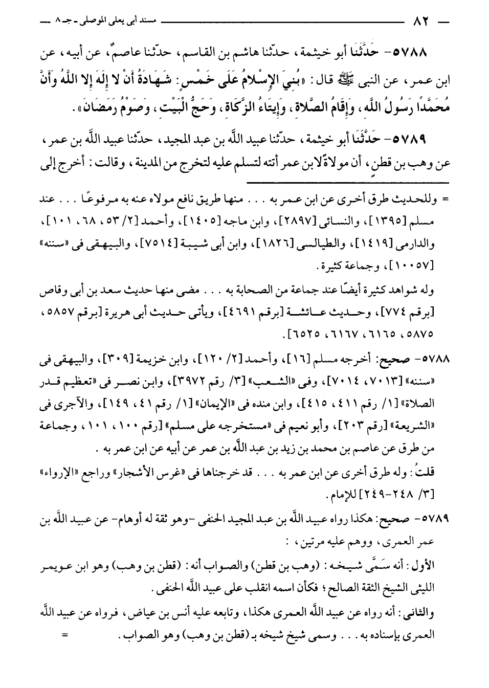 ٥٧٨٨ - حَدَّثَنا أبو خيثمة، حدّثنا هاشم بن القاسم، حدّثنا عاصم، عن أبيه، عن ابن عمر، عن النبي - صلى الله عليه وسلم - قال: "بُنِيَ الإِسْلامُ عَلَى خَمْسٍ: شَهَادَةُ أَنْ لا إِلَهَ إِلا الله وَأَنَّ مُحَمَّدًا رَسُولُ اللهِ، وَإِقَامُ الصَّلاةِ، وَإِيتَاءُ الزَّكاةِ، وَحَجُّ الْبَيْتِ، وَصَوْمُ رَمَضَانَ".