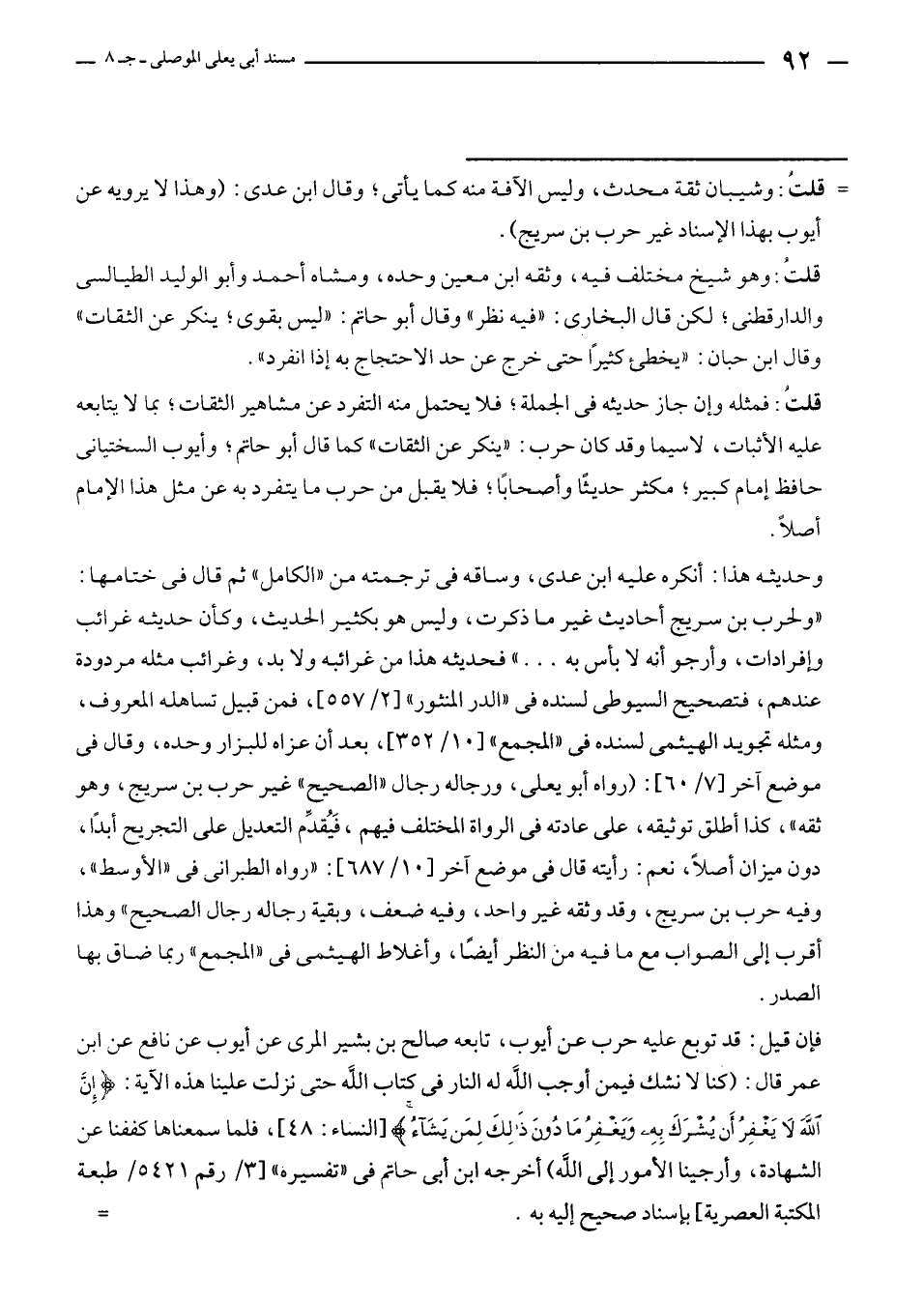 فإن قيل: قد توبع عليه حرب عن أيوب، تابعه صالح بن بشير المرى عن أيوب عن نافع عن ابن عمر قال: (كنا لا نشك فيمن أوجب الله له النار في كتاب الله حتى نزلت علينا هذه الآية: {إِنَّ اللَّهَ لَا يَغْفِرُ أَنْ يُشْرَكَ بِهِ وَيَغْفِرُ مَا دُونَ ذَلِكَ لِمَنْ يَشَاءُ} [النساء: ٤٨]، فلما سمعناها كففنا عن الشهادة، وأرجينا الأمور إلى الله) أخرجه ابن أبى حاتم في "تفسيره" [٣/ رقم ٥٤٢١/ طبعة المكتبة العصرية] بإسناد صحيح إليه به. =