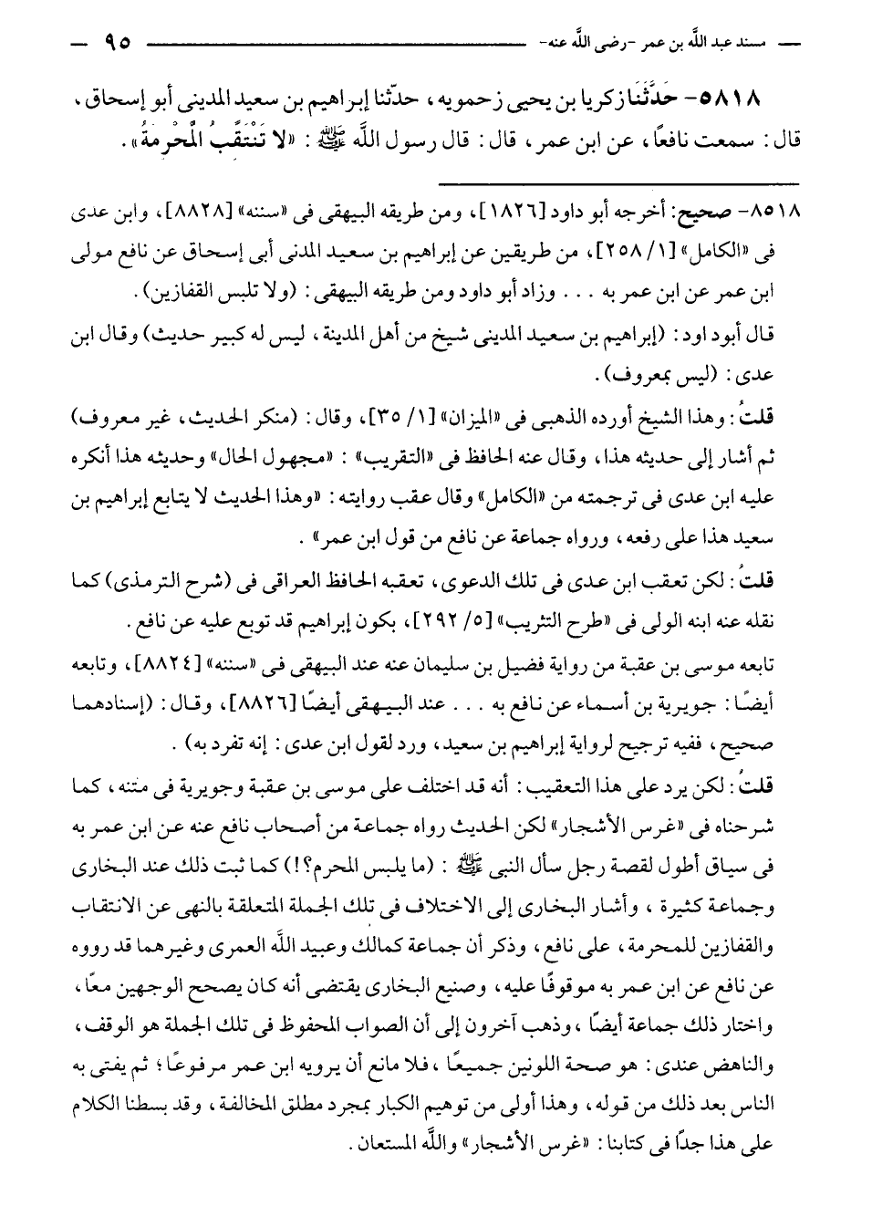 ٥٨١٨ - حَدَّثَنَا زكريا بن يحيى زحمويه، حدّثنا إبراهيم بن سعيدٍ المدينى أبو إسحاق، قال: سمعت نافعًا، عن ابن عمر، قال: قال رسول الله - صلى الله عليه وسلم -: "لا تَنْتَقِبُ المُحْرِمة".
