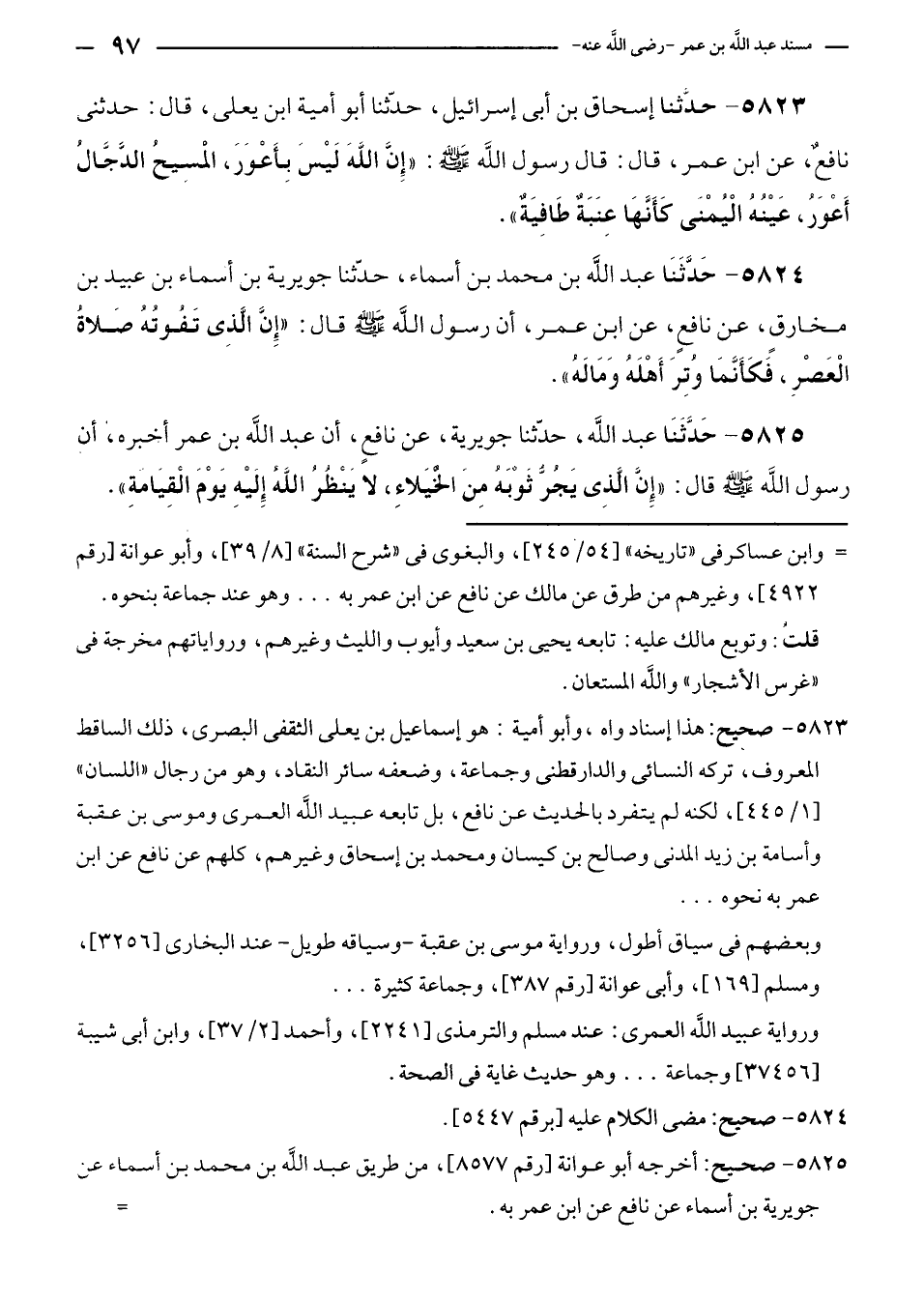 ورواية عبيد الله العمرى: عند مسلم والترمذى [٢٢٤١]، وأحمد [٢/ ٣٧]، وابن أبى شيبة [٣٧٤٥٦] وجماعة ... وهو حديث غاية في الصحة.
