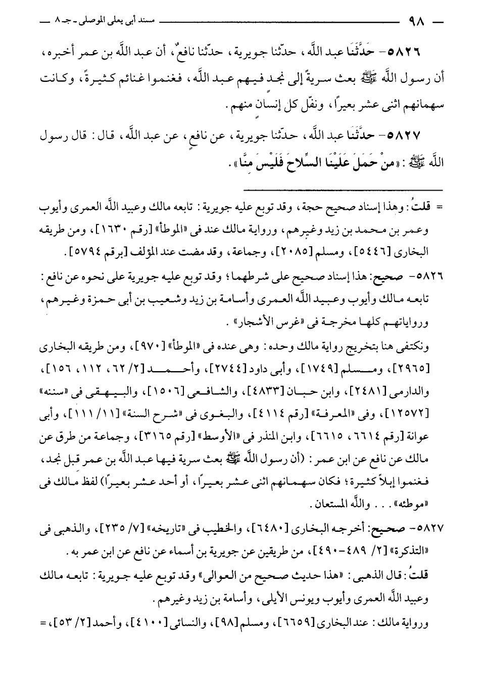 ٥٨٢٦ - صحيح: هذا إسناد صحيح على شرطهما؛ وقد توبع عليه جويرية على نحوه عن نافع: تابعه مالك وأيوب وعبيد الله العمرى وأسامة بن زيد وشعيب بن أبى حمزة وغيرهم، ورواياتهم كلها مخرجة في "غرس الأشجار".