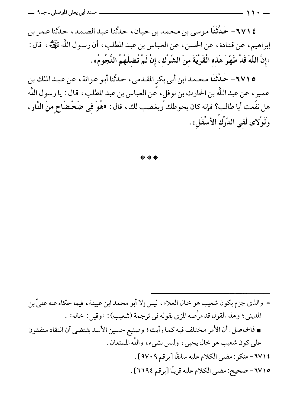 ٦٧١٤ - حَدَّثَنَا موسى بن محمد بن حيان، حدّثنا عبد الصمد، حدّثنا عمر بن إبراهيم، عن قتادة، عن الحسن، عن العباس بن عبد المطلب، أن رسول الله - صلى الله عليه وسلم -، قال: "إِنَّ اللَّهَ قَدْ طَهَّرَ هَذِهِ الْقَرْيَةَ مِنَ الشِّرْكِ، إِن لَمْ تُضِلَّهُمُ النُّجُومُ".