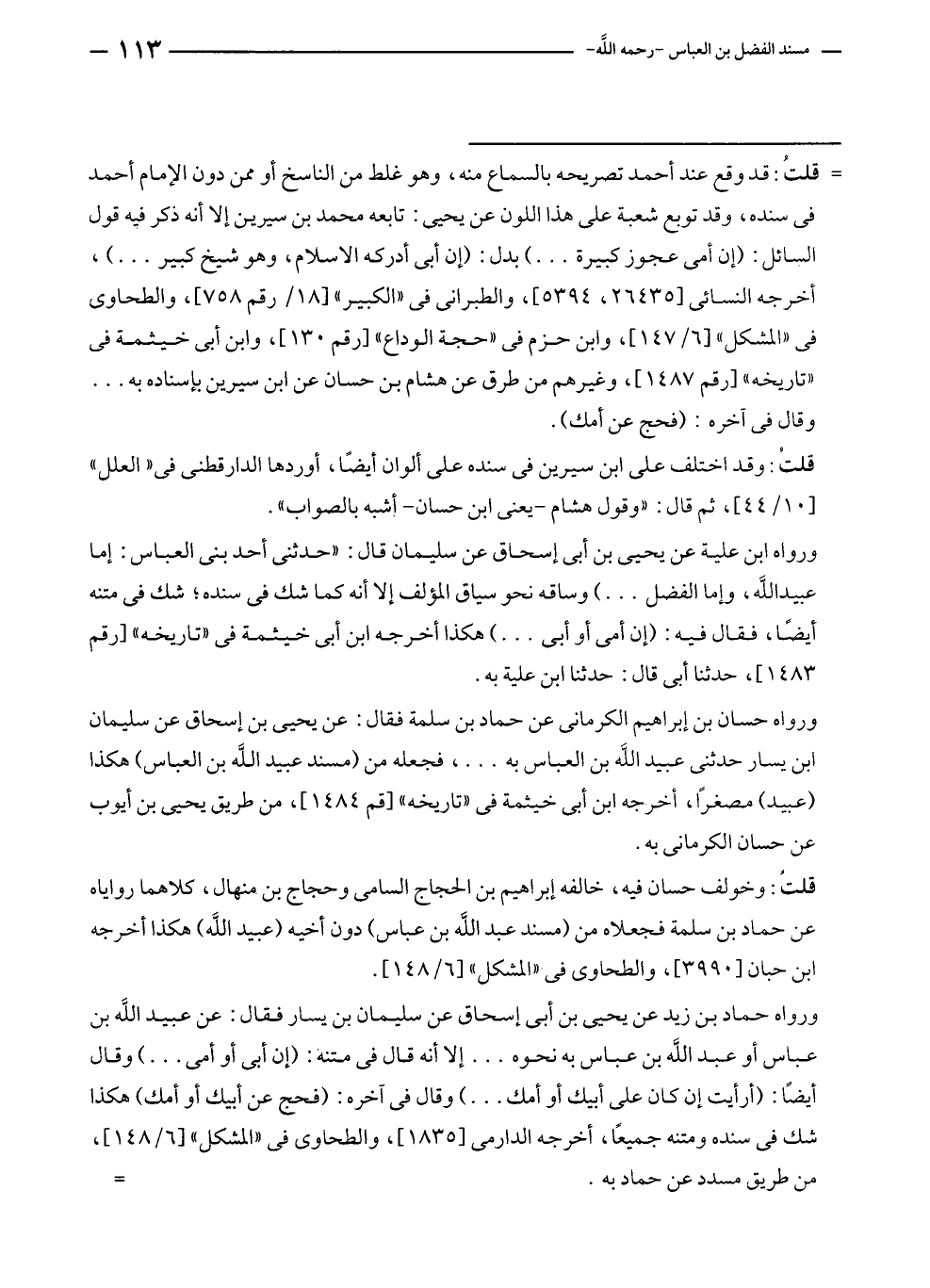 ورواه ابن علية عن يحيى بن أبي إسحاق عن سليمان قال: "حدثني أحد بنى العباس: إما عبيد الله، وإما الفضل ... ) وساقه نحو سياق المؤلف إلا أنه كما شك في سنده؛ شك في متنه أيضًا، فقال فيه: (إن أمى أو أبي ... ) هكذا أخرجه ابن أبي خيثمة في "تاريخه" [رقم ١٤٨٣]، حدثنا أبي قال: حدثنا ابن علية به.