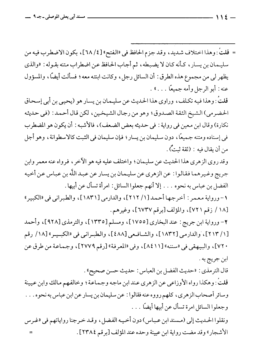 قلتُ: وهكذا رواه الأوزاعي عن الزهري عند ابن ماجه وجماعة؛ وخالفهم مالك وابن عيينة وسائر أصحاب الزهري، كلهم رووه عنه فقالوا: عن سليمان بن يسار عن ابن عباس به نحوه ... وجعلوا السائل امرة تسأل عن أبيها أيضًا ...